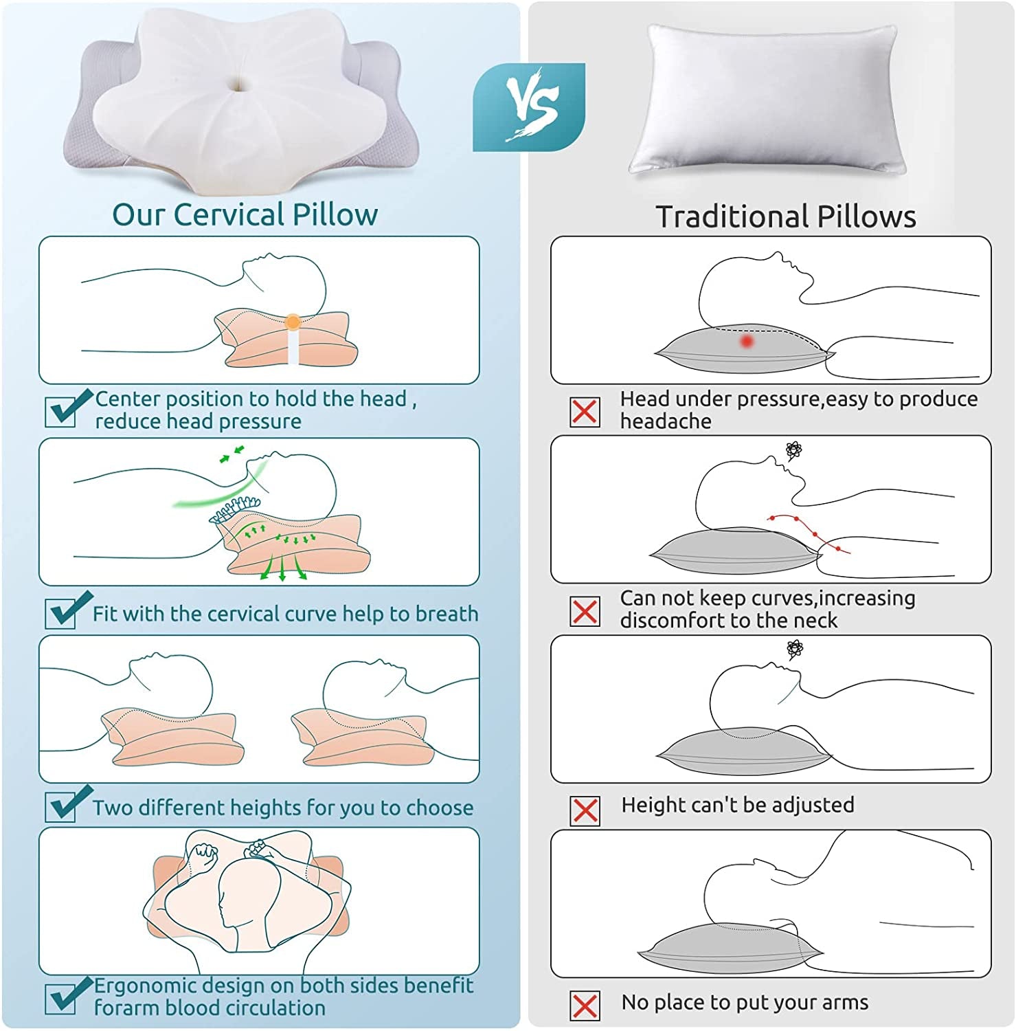 - 【2 HEIGHTS AND ARMREST DESIGNS】When you are still troubled about not finding the right height pillow, our cervical pillows have 2 different heights on both sides for you to choose(Lower Side-3.54",Higher Side 5.51"), so you can choose the right one which is more suitable for your sleeping posture. And there are specific grooves that allows your arms to go under for comfortable sleep.The entire pillow size is 24.8"Lx14.96"Wx5.51"H, and it can keep your head smoothly on the pillow even you roll when you sleep.