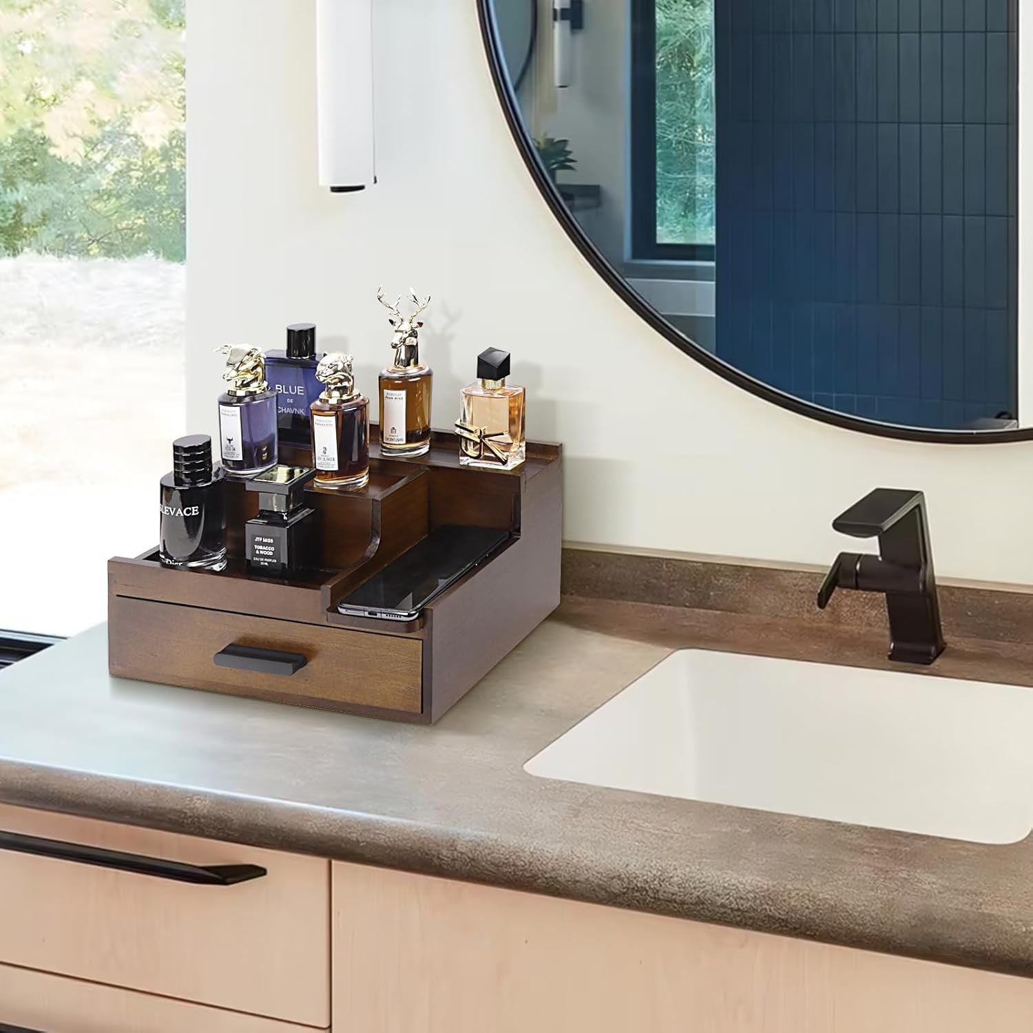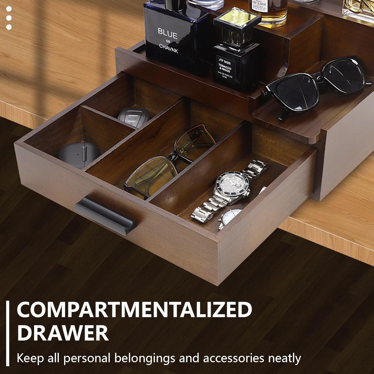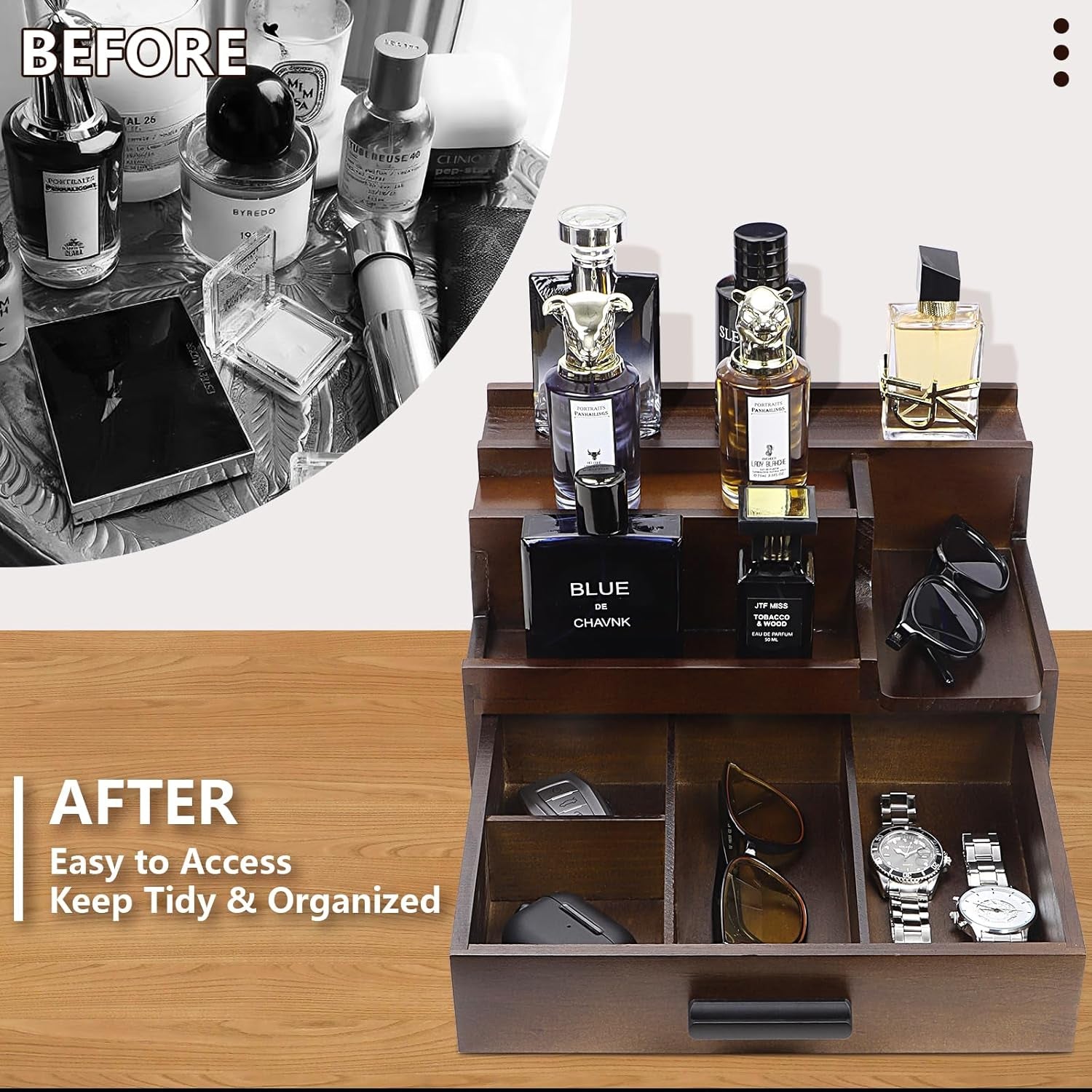 - 💝【PRACTICAL DRAWER 】The cologne holder features compartmentalized drawer, keep all personal belongings and accessories neatly. Especially for some small items: wallets, watches, glasses, iPod, rings, necklaces, car keys and other daily necessities. Removable divider also provide a size customization according to your needs.