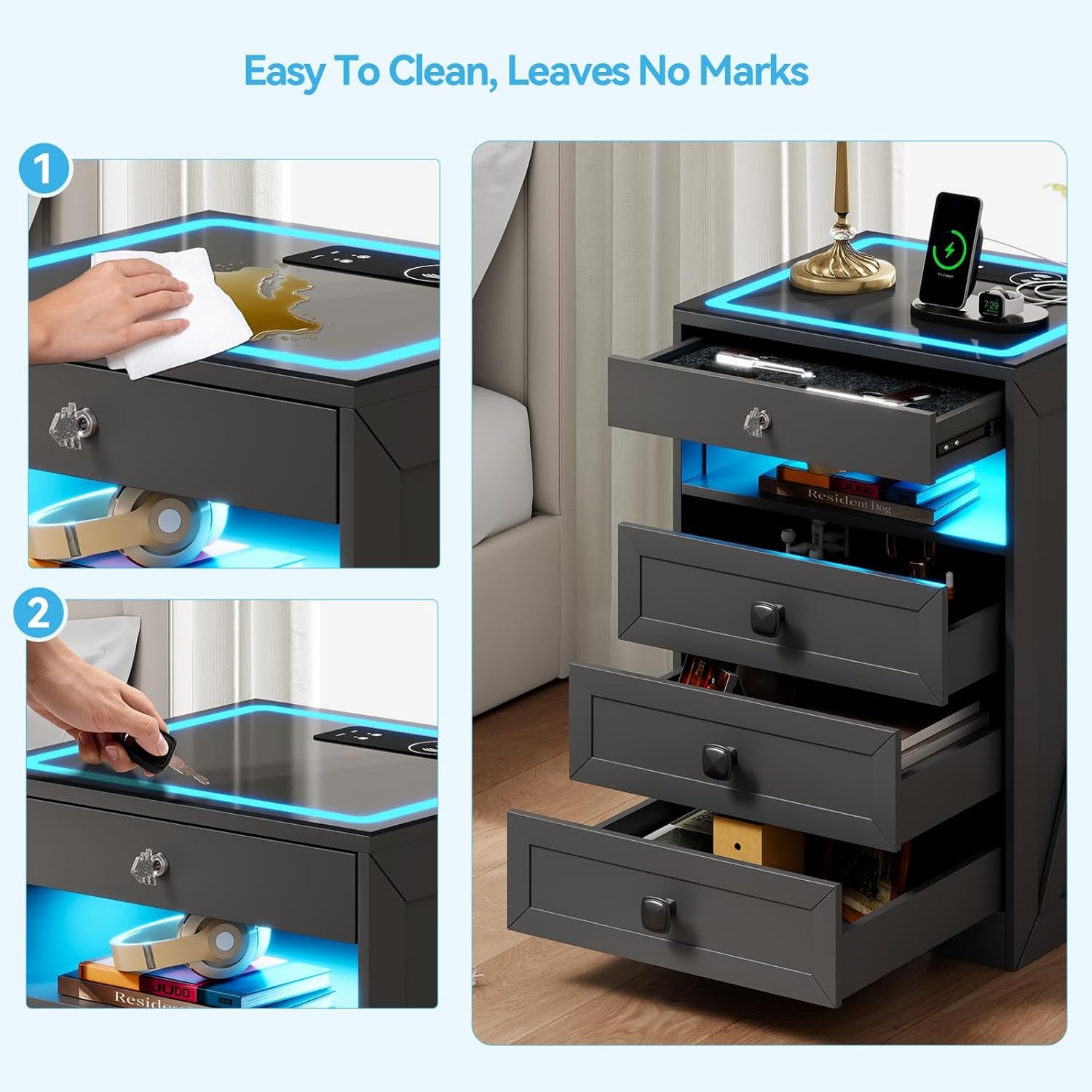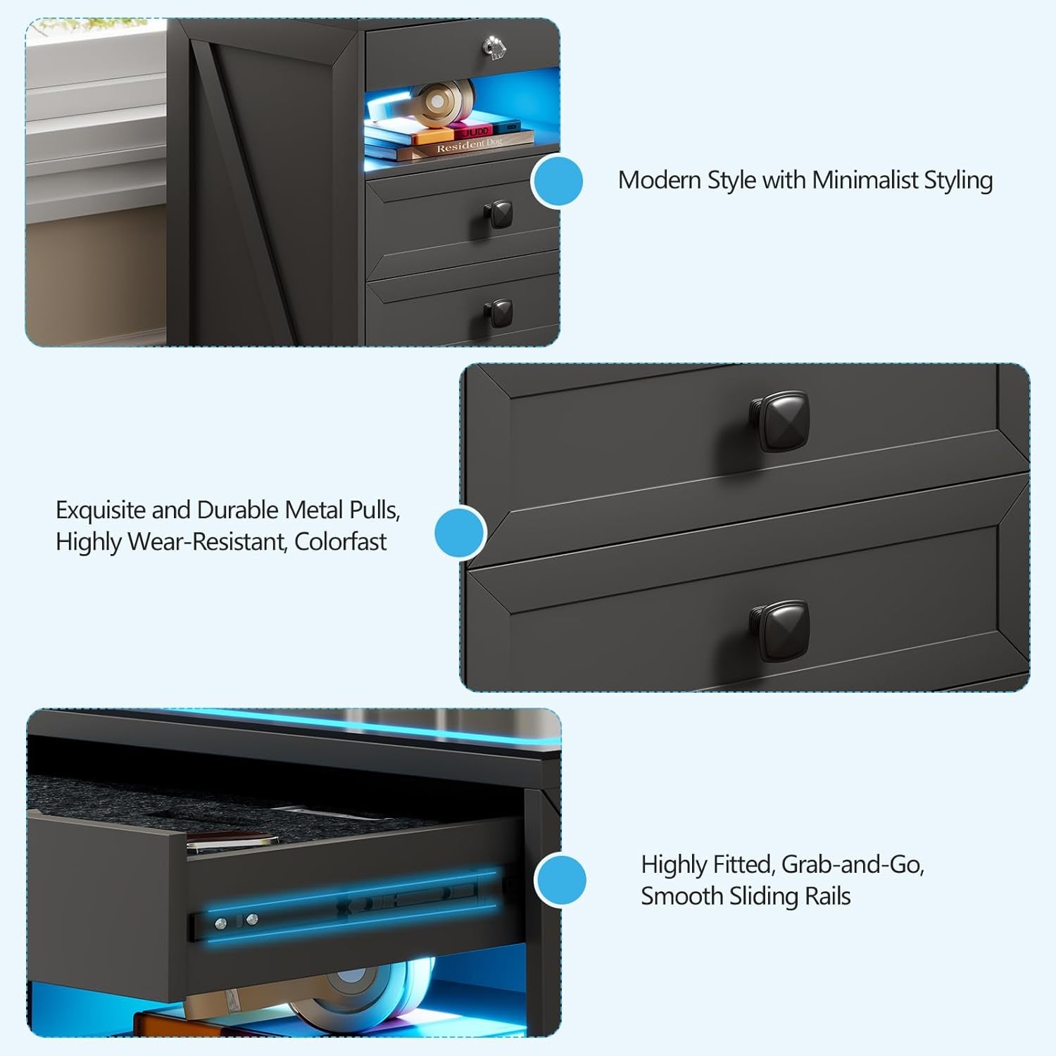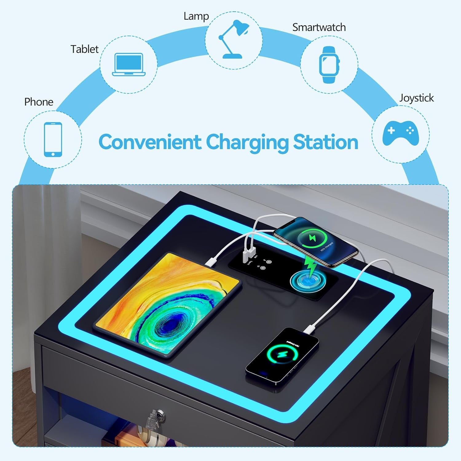 • 【3-In-1 Charging Station】 The modern night stands is designed with wireless charging station and USB & Type-C Port, you can charge all your devices at once without the need for multiple chargers.No need to worry about tangled wires