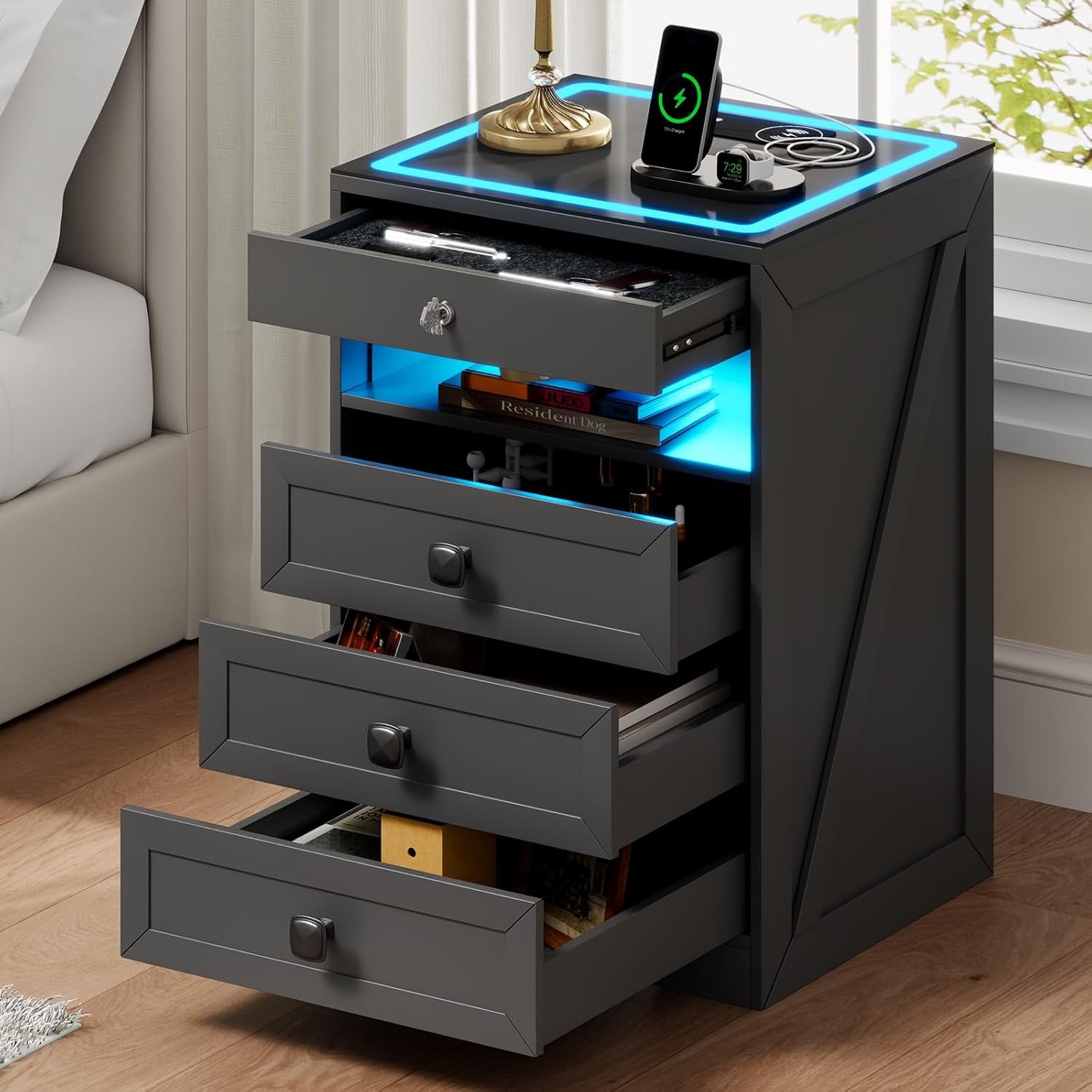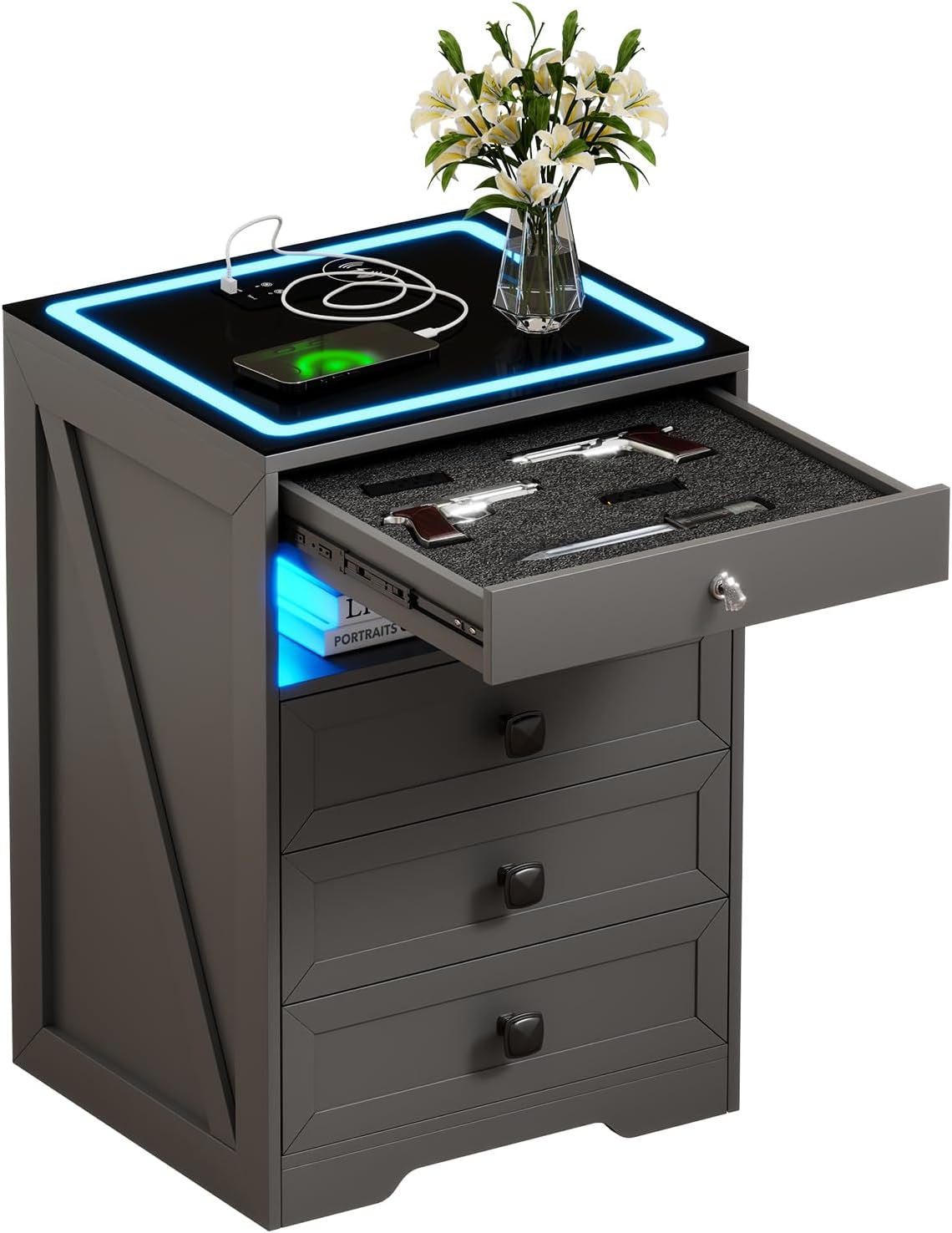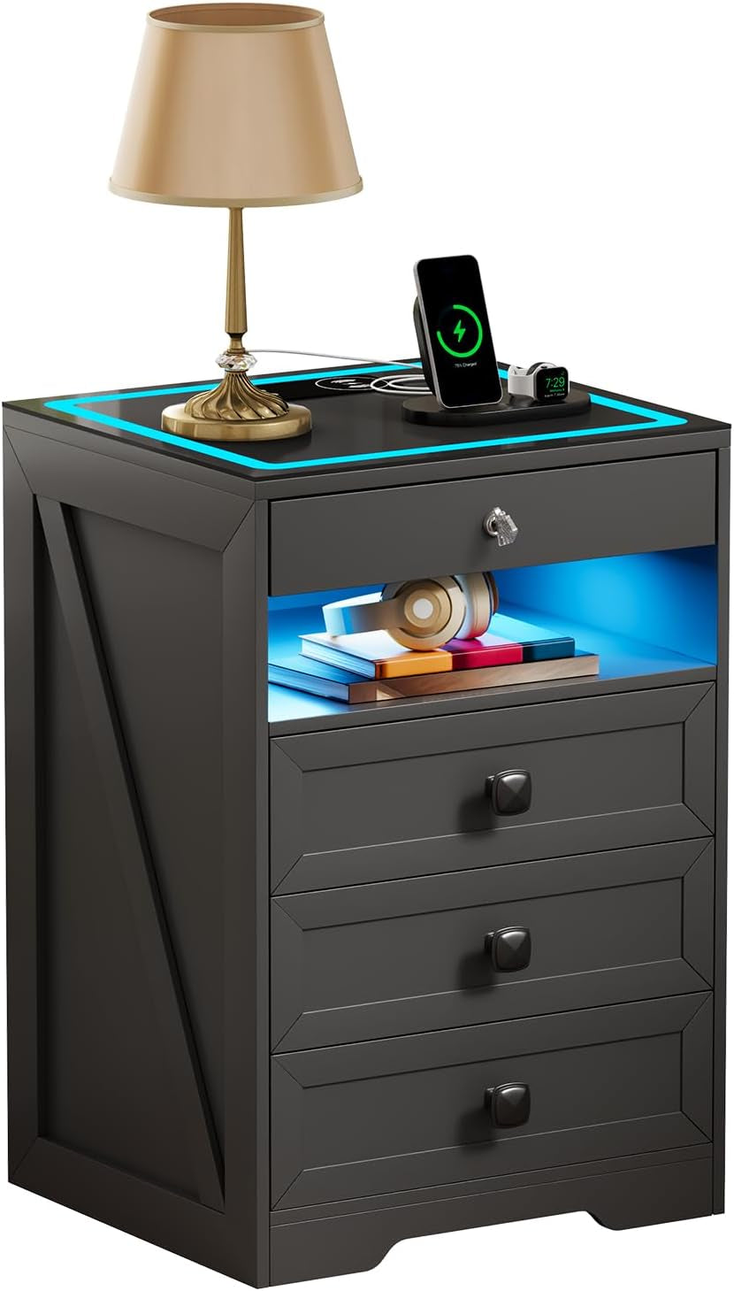 LED Night Stand with Gun Drawer, Modern Nightstand with Wireless Charging Station, Smart Bedside End Table with Glass Top&4 Drawes&Lights for Bedroom/Livingroom (Grey)