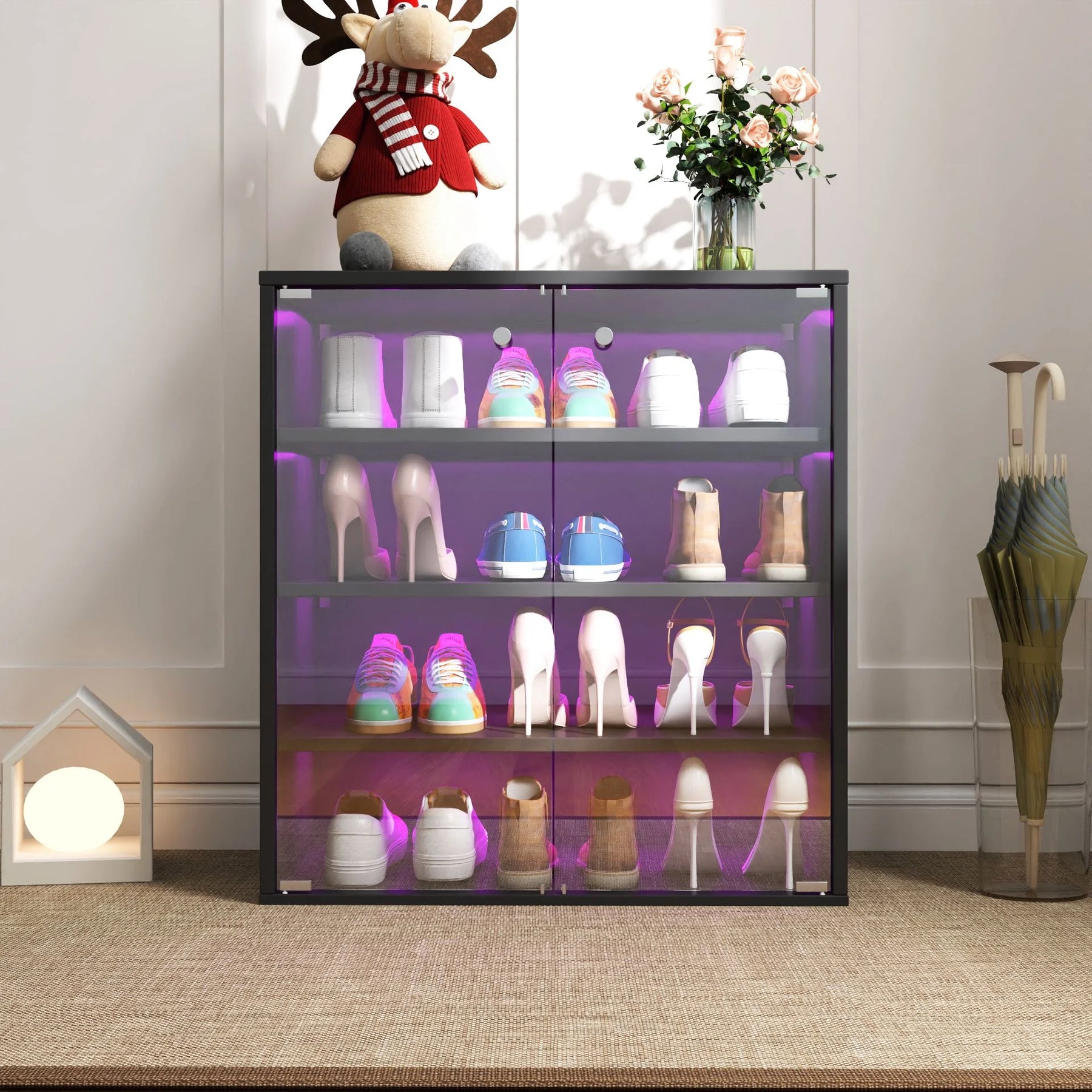 • Black Living Room Cabinets, Premium Quality: The Shoe Organizer Is Made Of High Quality Particle Board And Tempered Glass Which Is Durable To Use.Rgb Led Light: Includes Led Color Changing Light, You Can Choose Your Favorite Color Through The Remote Control To Showcase And Highlight Your Favorite Sneakers
