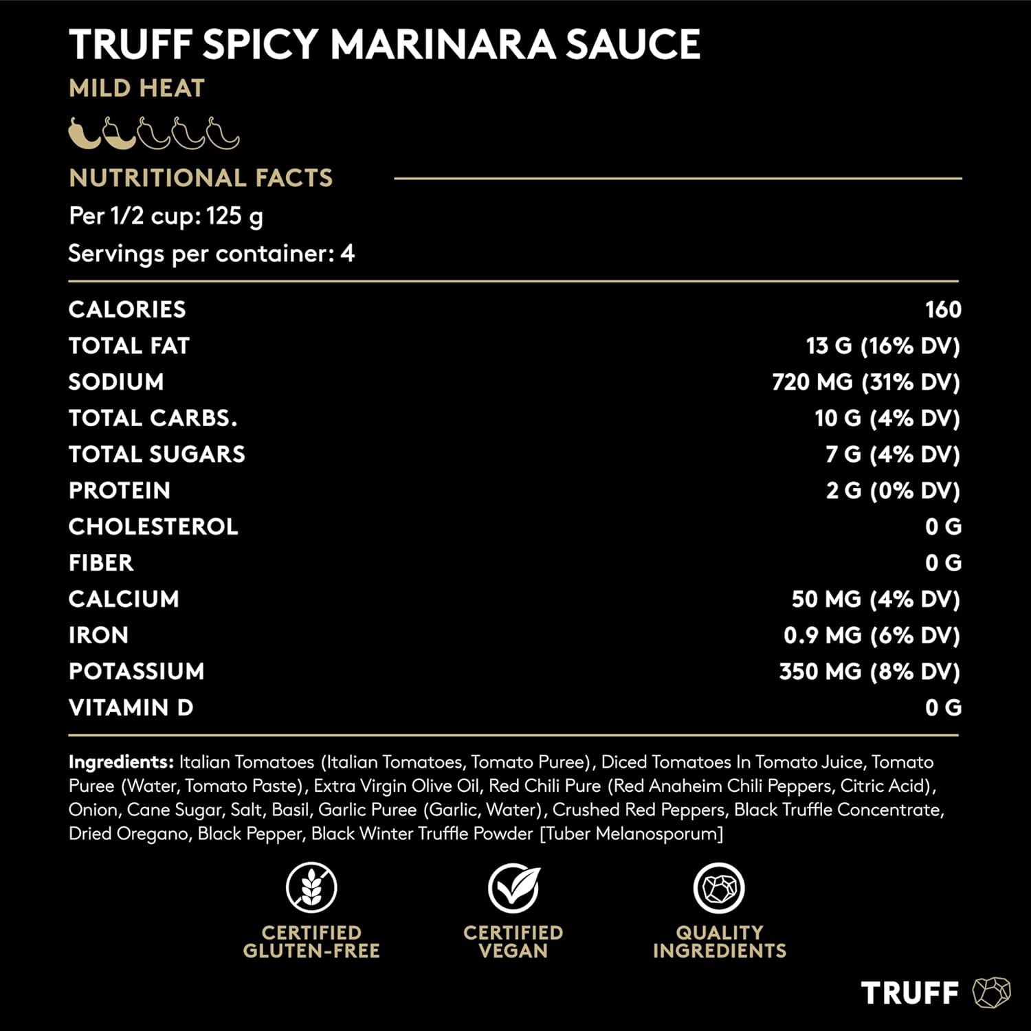 - Only the best ingredients. Focused on flavor, our Black Truffle Spicy Marinara is a blend of ripe tomatoes, delicate herbs, black winter truffle, and a generous dose of red chili peppers that transforms lazy dinners into adventurous dining.
