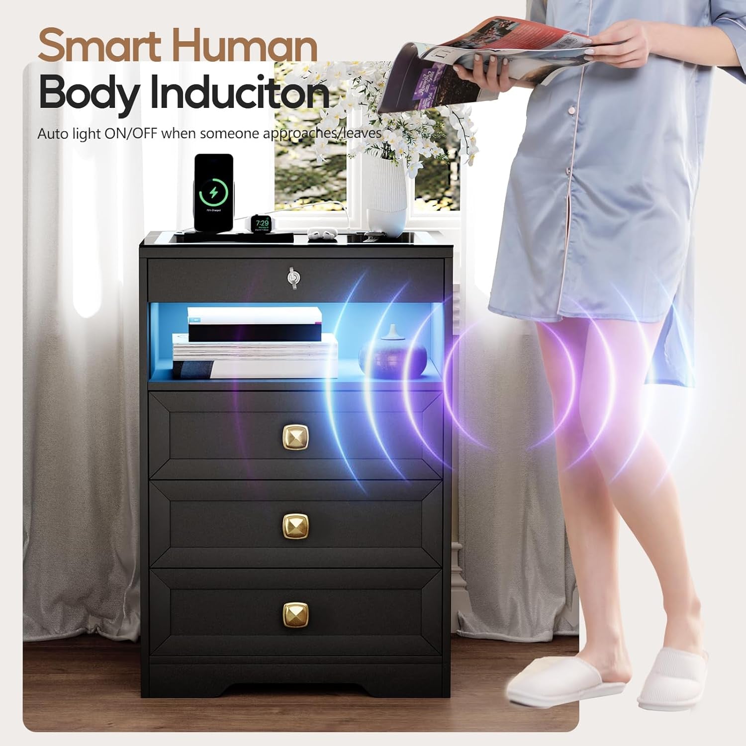 - 3 Color Lighting Options:The smart bedside table comes with beautiful 3 Color LED Lights. You can set the lighting according to your needs and preferences. .Auto-sensing mode:auto-on when approaching, auto-off when leaving