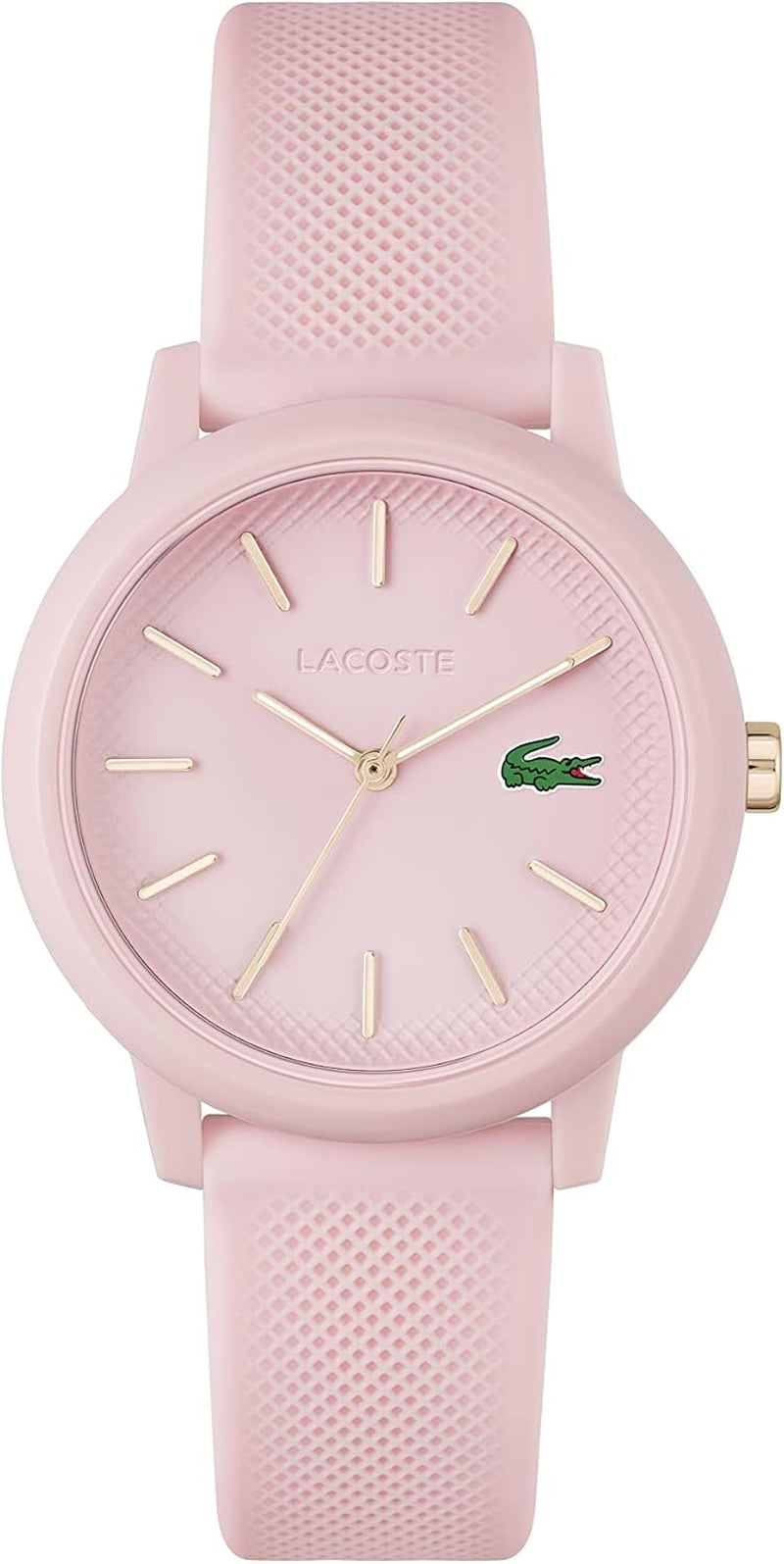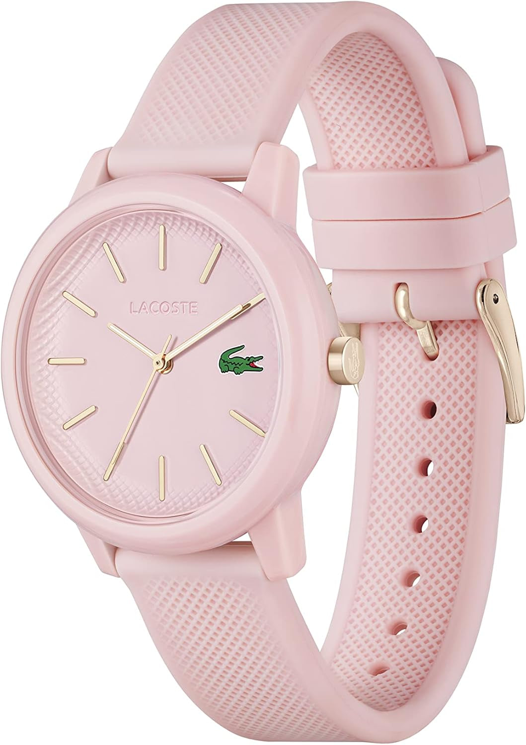 The Lacoste.12.12 for her watch reimagines the iconic polo shirt design. It features a petit-piqué pattern on the dial and strap, with a Lacoste crocodile at 3 o’clock. Available in a semi-transparent finish for a modern look.