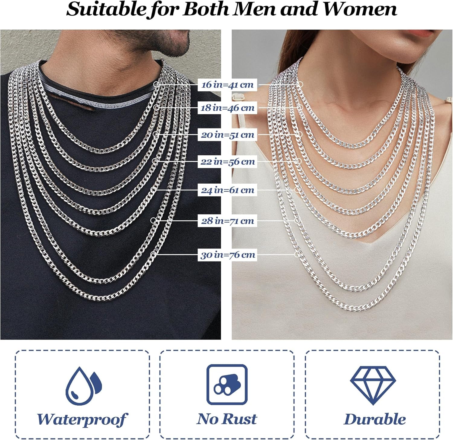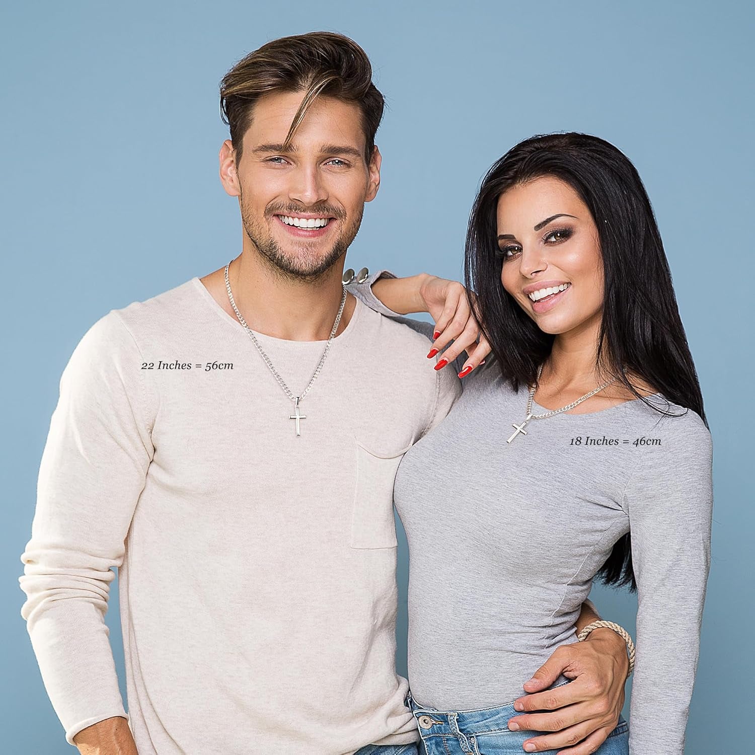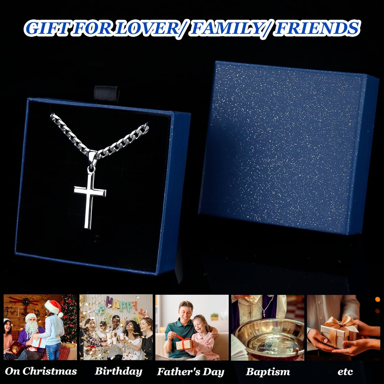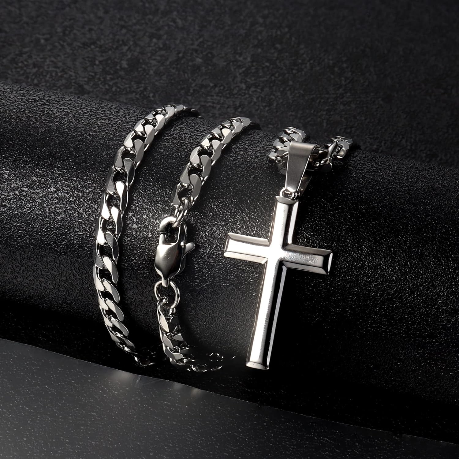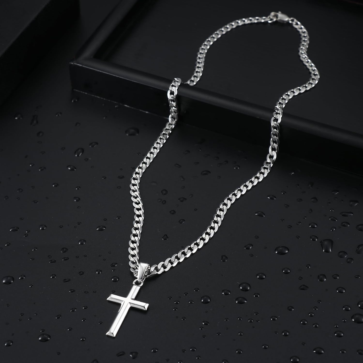 925 Sterling silver beveled edge cross pendant with stainless steel diamond cut durable cuban link chain.