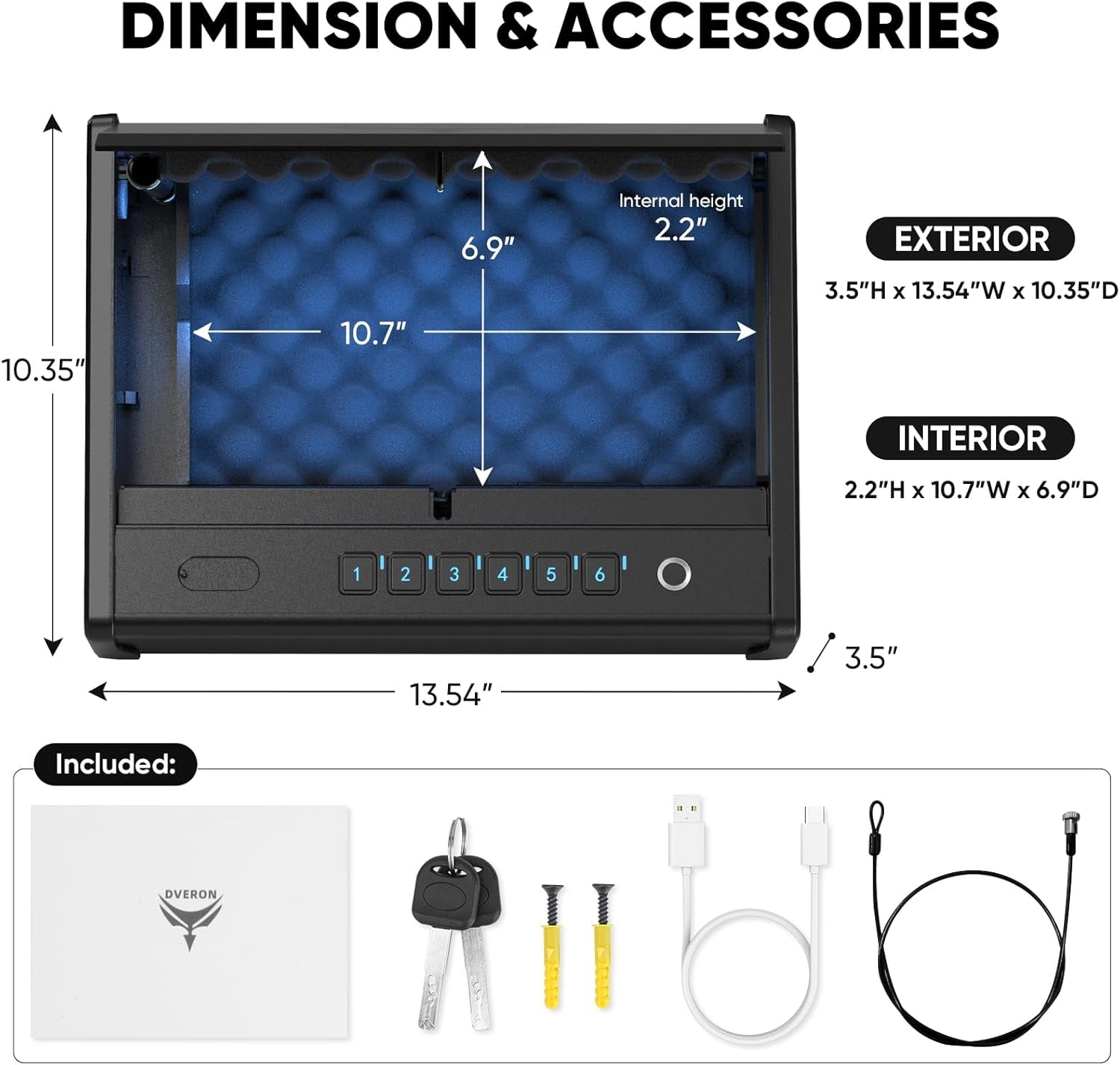 The DVERON SE0101 Biometric Handgun Safe with Interior LED Light is an excellent solution for quick access to your handgun, plus keeping it and your valuables secure. With three methods for quick entry - Key Lock, Biometric Fingerprint, and Digital Keypad - you'll have easy access to your items in any situation. The interior lighting provides increased visibility, making locating your items quickly and efficiently easy. Biometric fingerprint scanner can store up to 20 fingerprint scans, ensuring only authorized users have access.