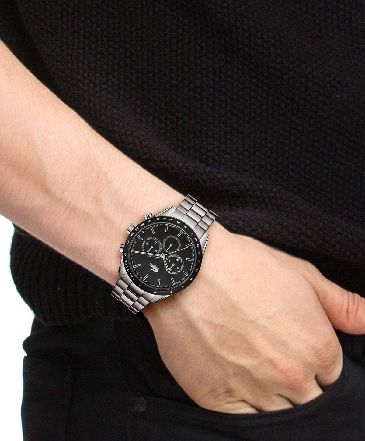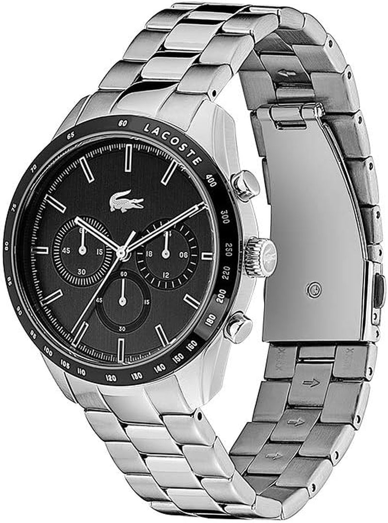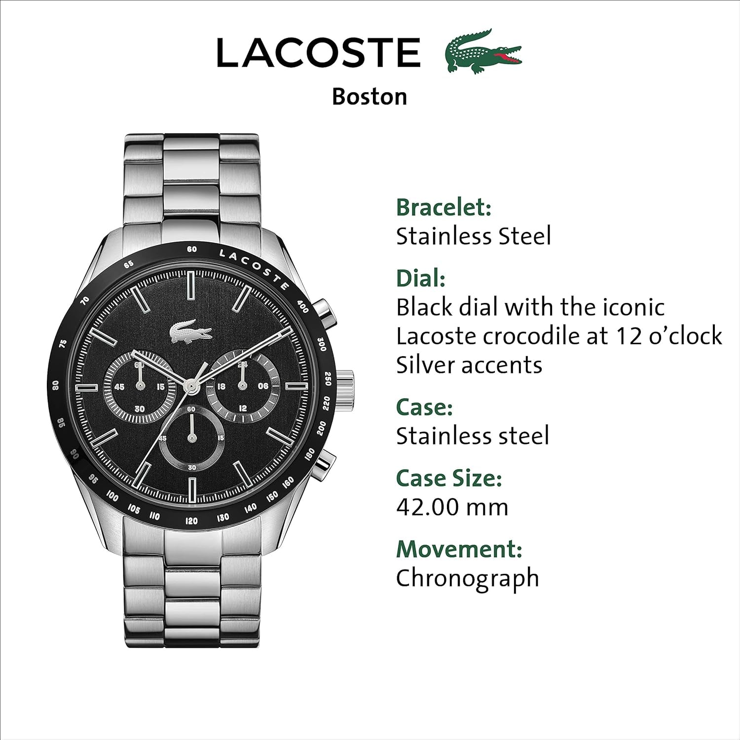 Effortlessly refined, the Lacoste Boston is a timeless chronograph exuding sporty sophistication. It features three subeyes with a circular grooved finish, a circular-brushed dial, and a flat colored aluminum bezel with a tachymeter.
