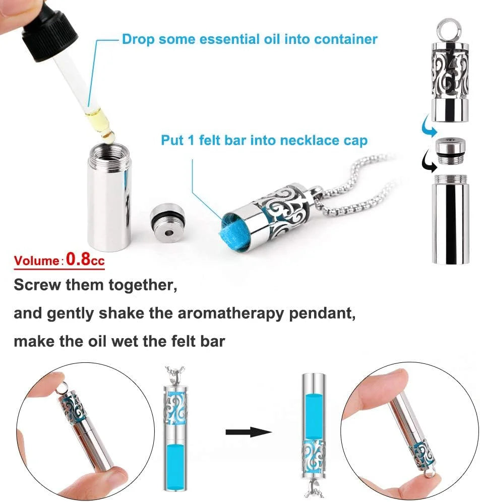 • Easy to Use: Our essential oil diffuser necklaces have a container at the bottom that holds approximately 0.8cc of essential oils. Instead of constantly dripping essential oils onto the felt pad like other aromatherapy necklace, you place the felt strip in the hollow and add the oils to the bottom container. When you need it, shake the bottle and let the essential oil wet the felt pad.