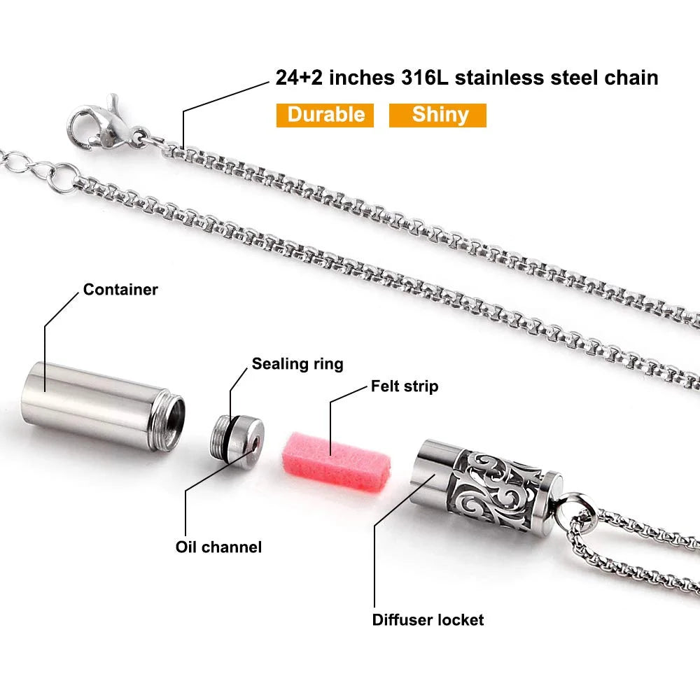 • High Quality Material: The surface of the diffuser necklace is processed by advanced electroplating process, the exquisite workmanship makes the diffuser pendant evenly colored with smooth edges. Our essential oil necklace made of anti-allergic 316L stainless steel material is waterproof, long-lasting and durable. Harmless to your skin and health, providing you with a comfortable wearing experience.