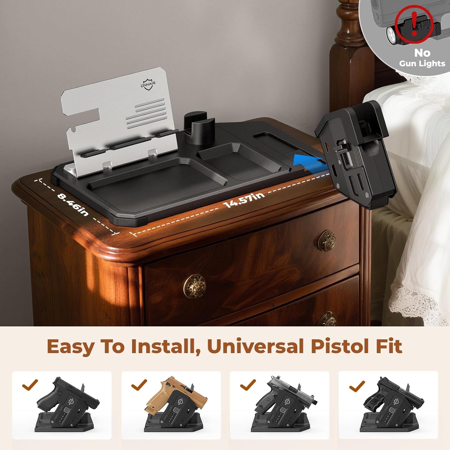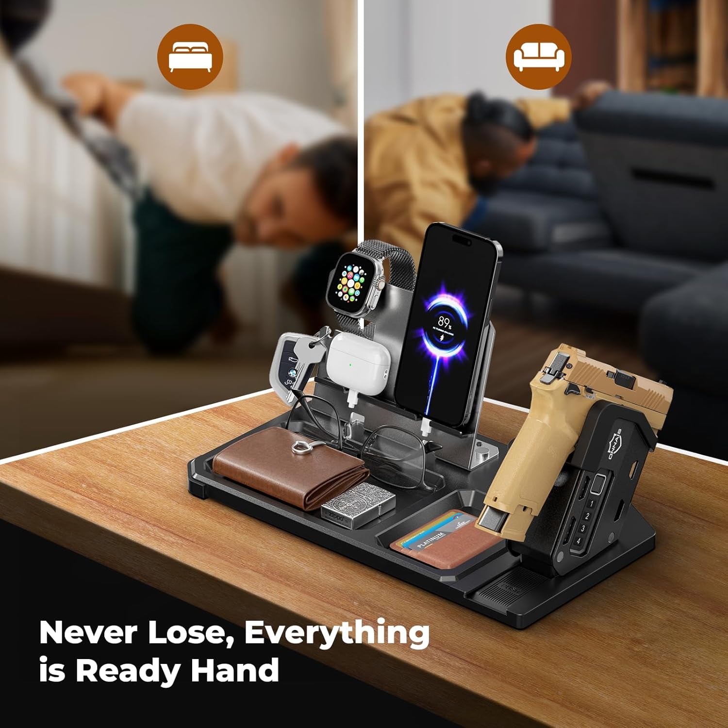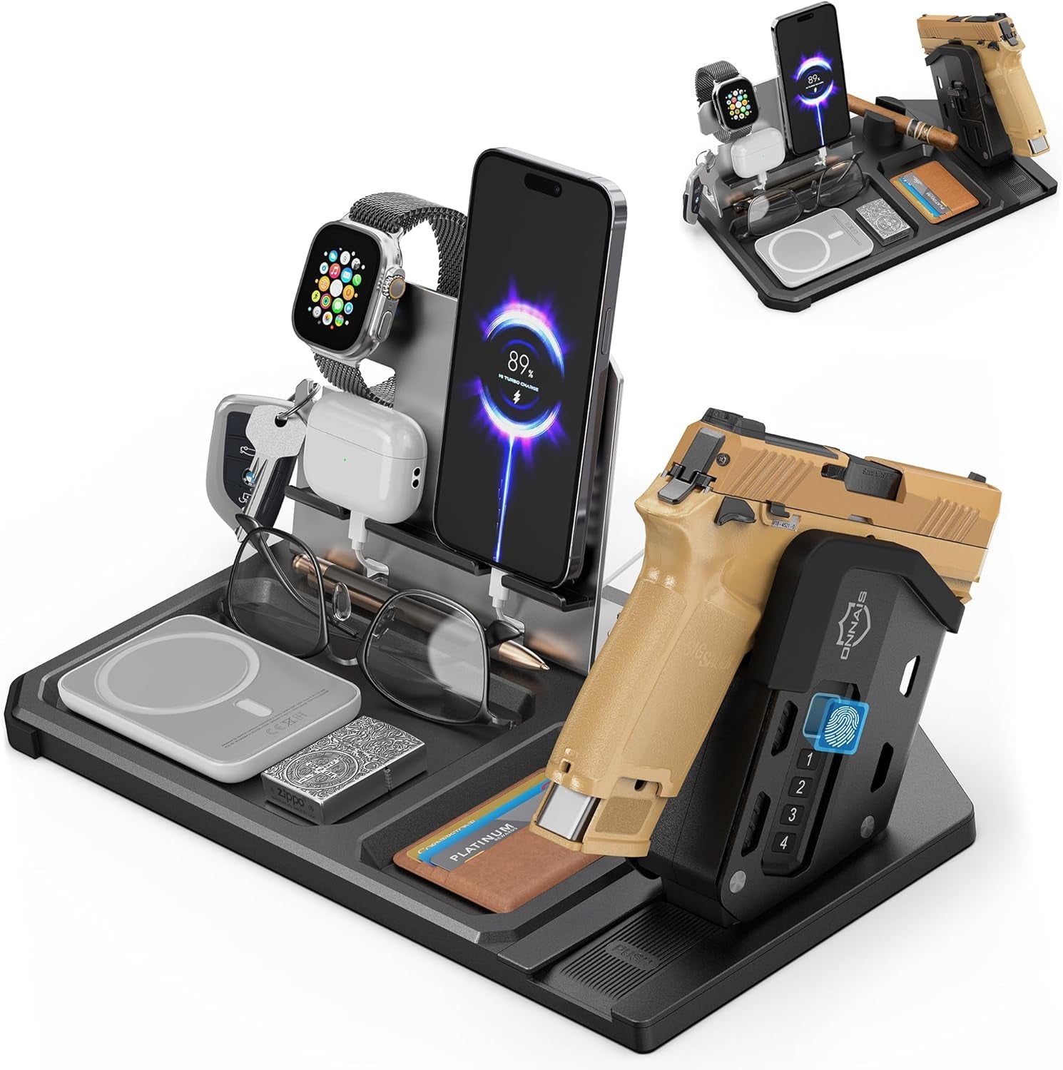 - All-in-One Tactical & EDC Organizer: Keep your tactical gear and everyday essentials perfectly organized. This multi-functional nightstand organizer eatures dedicated compartments for your gun, phone, watch, wallet, keys, glasses, and more—transforming your nightstand or desk into a clutter-free, streamlined space. Say goodbye to messy desktop. Please note! Accessories shown in the pictures are not included