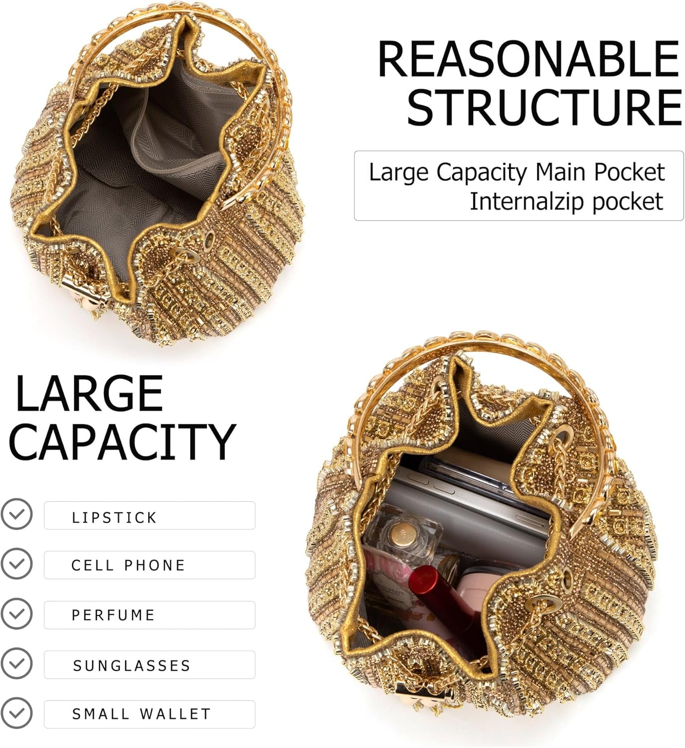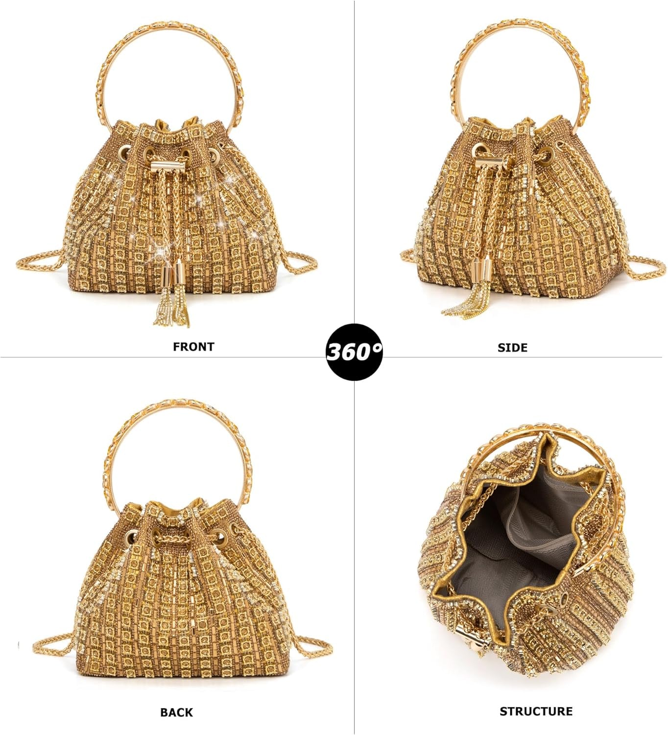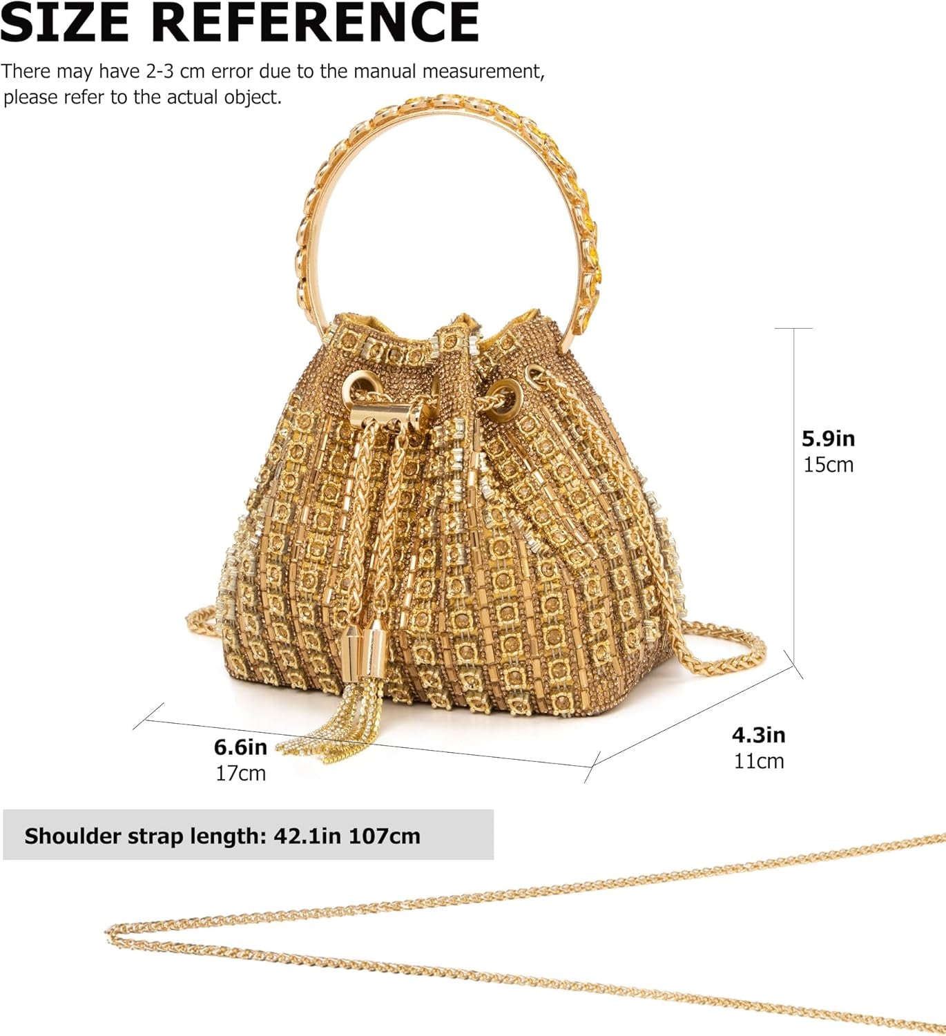 FEATURES: Full of dazzling rhinestones + Crystal-Encrusted Metal Loop Handles + Removable High Quality Long Chain + Soft Fabric Lining + Tassel Decoration + Chain Closure, Keeps Things Safe