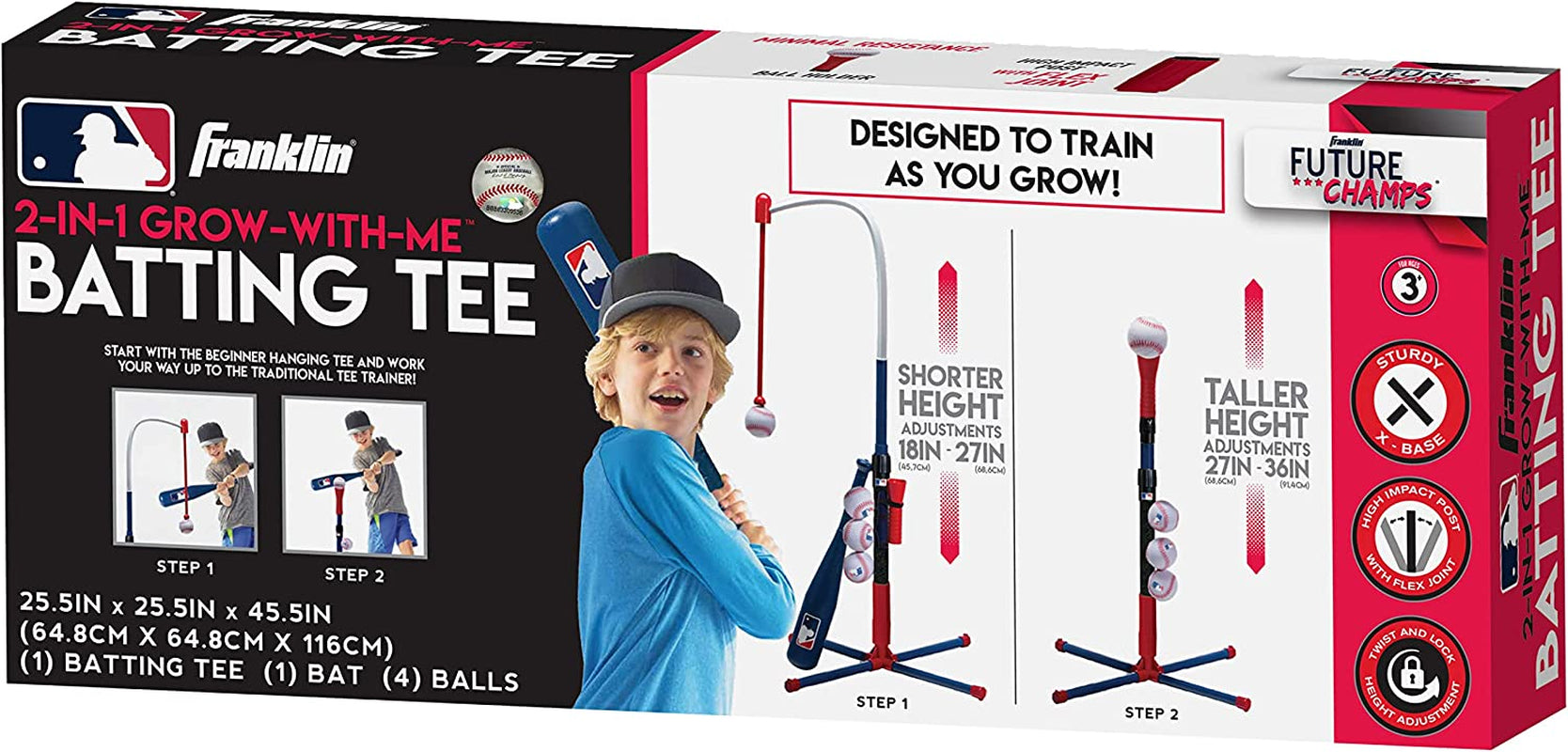 The Franklin Sports Self-Stick Baseballs were designed for little athletes to make learning fun! Each self-stick baseball pairs perfectly with the Franklin Sports 2-in-1 Grow-with-Me Batting Tee, which uses self-stick technology to hang the ball off of the tee as well as store the balls on the vertical tee post! Offered in a bright white color, the balls are vibrant enough so kids can easily hit each ball with ease, promoting hand-eye coordination at a young age! Perfect for ages 3+, your future major leaguers will immediately start to learn the fundamentals of baseball. The set includes 4 self-stick covered baseballs to get the game started!. The Franklin Future Champs MLB 2-in-1 Grow-with-Me Baseball Tee is designed for first-time athletes learning to play teeball or baseball. The set is engineered to offer a 2-step process to truly train as you grow. Kids start with the beginner Hanging Baseball Tee, and eventually work their way up to the Traditional Baseball Tee Trainer. The Hanging Ball Tee suspends the ball 18" to 26" from the ground for smaller, first-time players. Simply attach the baseball to end of the hanging arm using self-stick technology and swing away! The hanging design is perfect for teaching young players how to swing while improving hand eye coordination! Once younger players gain confidence and start to grow, the hanging arm can be removed and replaced with the traditional ball tee topper in seconds. The traditional style tee adjusts from 25" to 36" so young players can continue to practice as they grow! The set comes with (1) 21" plastic bat and (4) baseballs with self-stick covers so you have everything you need to get the game started. Start helping your young slugger learn the game today with the MLB Grow-with-Me Batting Tee!.