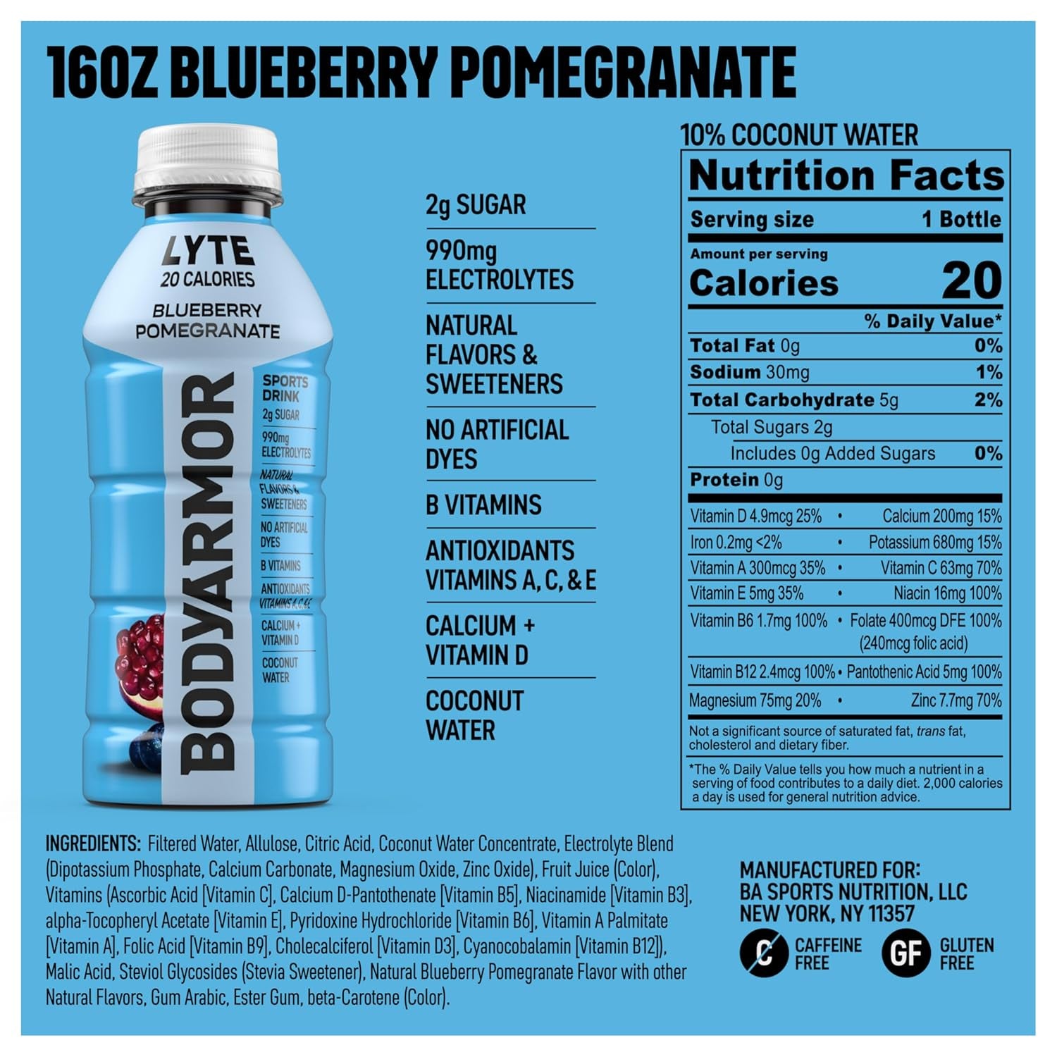 - 12 pack, 16 fl oz bottles of BODYARMOR Lyte Blueberry Pomegranate electrolyte drinks for hydration that keeps pace with your active lifestyle