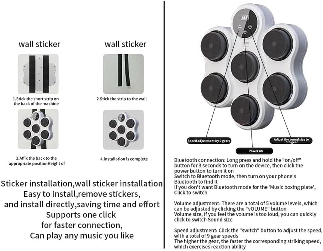 - 【Easy Installation】The music boxing machine workout machine comes with 4 pcs stickers. 2 long and 2 short. Stick the long ones on the wall and the short ones on the back of the machine, then hang the machine on the wall. (Please note: Do Not stick them on wallpaper or latex paint walls)
