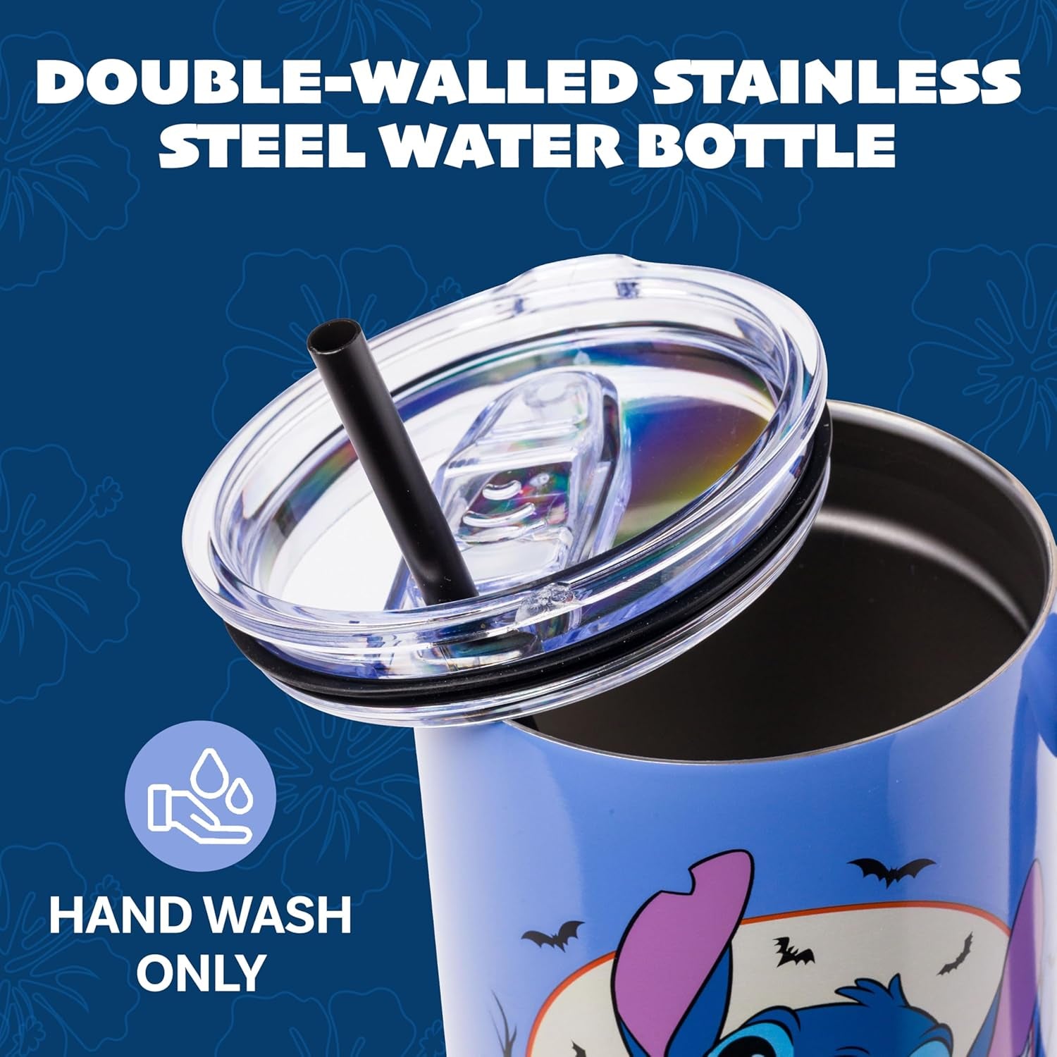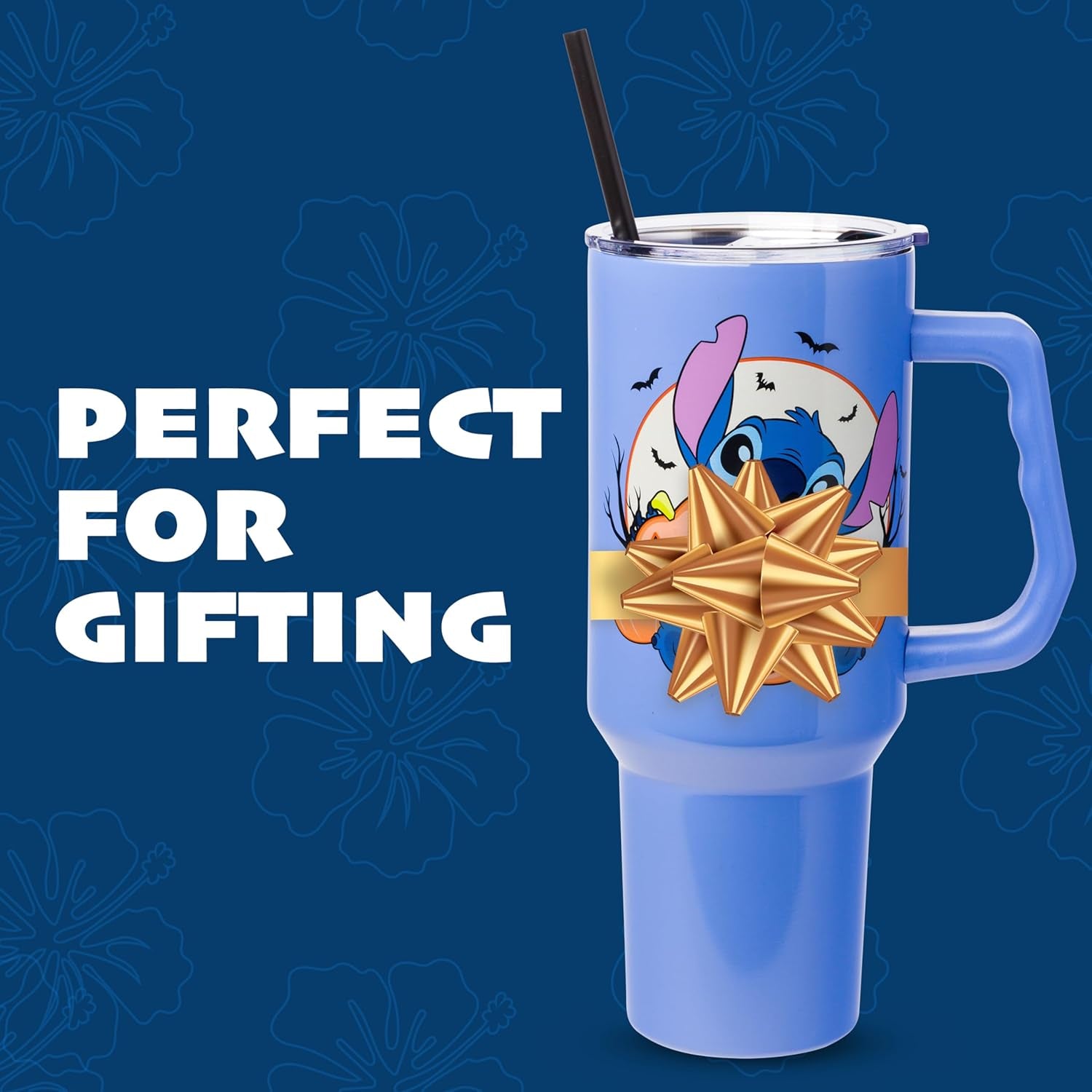 Stay hydrated on the go with this Lilo and Stitch stainless steel tumbler! This tumbler features the adorable Stitch holding a Jack-O-Lantern in a pumpkin patch. Behind Stitch is a full moon and images of bats. Tumbler is blue and has a black straw. This tumbler holds up to 40 ounces of your favorite beverage. It comes with a secure screw-on lid, reusable straw, and handle, making it the perfect companion to keep you hydrated while on the go. Tumbler is designed to fit in a standard cup holder. Whether you're on a road trip, at a sporting event, exercising, or enjoying a picnic, this tumbler is ideal for all your hydration needs. NOT microwave or dishwasher-safe; HAND WASH ONLY. Celebrate Halloween with this adorable tumbler! This stainless steel tumbler makes the sweetest Halloween treat for your favorite Lilo and Stitch fan. Perfect for enjoying your favorite beverage or as a collectors item. Take a dive into the fictional world with Silver Buffalo! Silver Buffalo provides fans with official merchandise from their favorite characters. Working alongside licensors and brands, we create unique and imaginative products which are designed with great care and detail. Silver Buffalo aims to connect fans to their favorite cartoon characters, superheroes, movies, tv-series, and more. Celebrate your fandom!