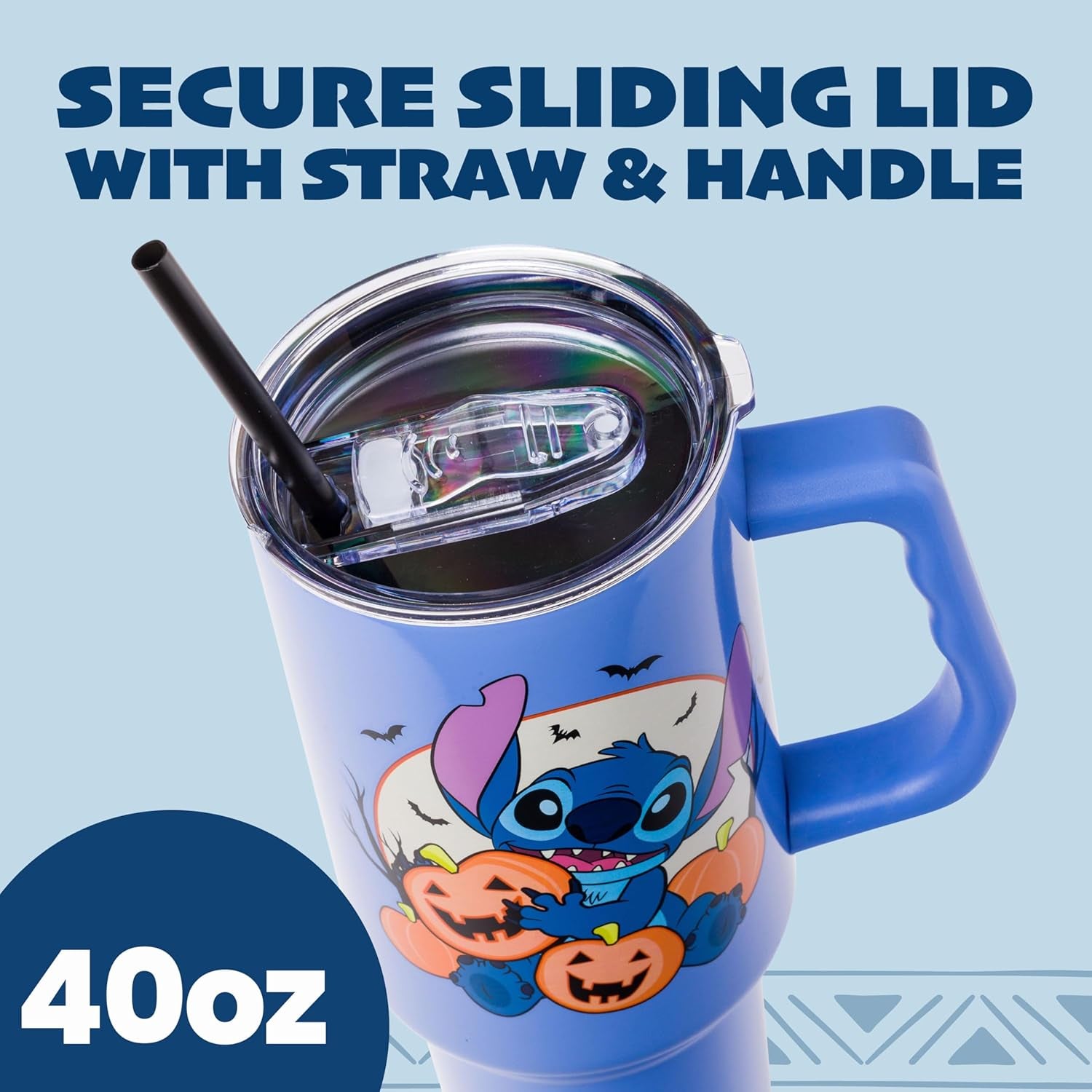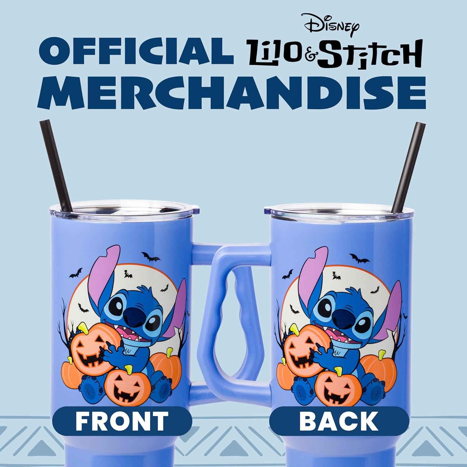 - LILO AND STITCH TUMBLER: This tumbler features the adorable Stitch holding a Jack-O-Lantern in a pumpkin patch. Behind Stitch is a full moon and images of bats. Tumbler is blue and has a black straw.