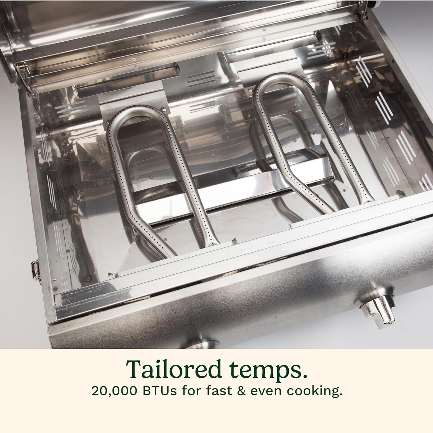 - POWERFUL PORTABLE GRILL: This BBQ grill features two powerful stainless steel burners, each with 10,000 BTUs of heat. With electronic ignition and independent control knobs, you can create custom heat zones for different foods