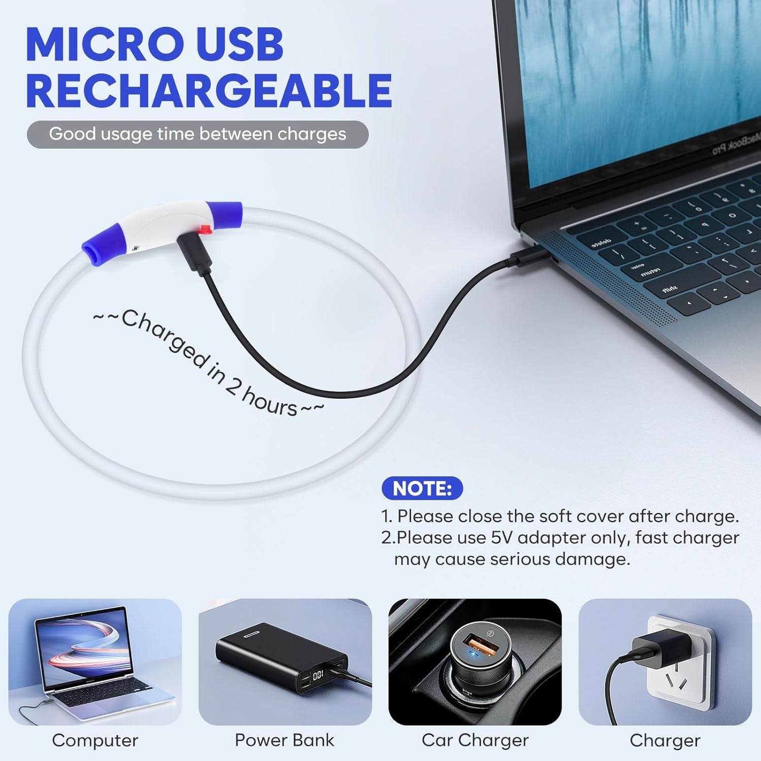 With a Mini USB port, This flashing safety dog camping light might be charged by Phone Chargers, Laptops, PC's, Tablets, Smart TV's Mains USB Power Adapters. 3 modes available: quick flashing-slow blinking-steady glow-off, just to press the on/off button to choose the modes that you need.