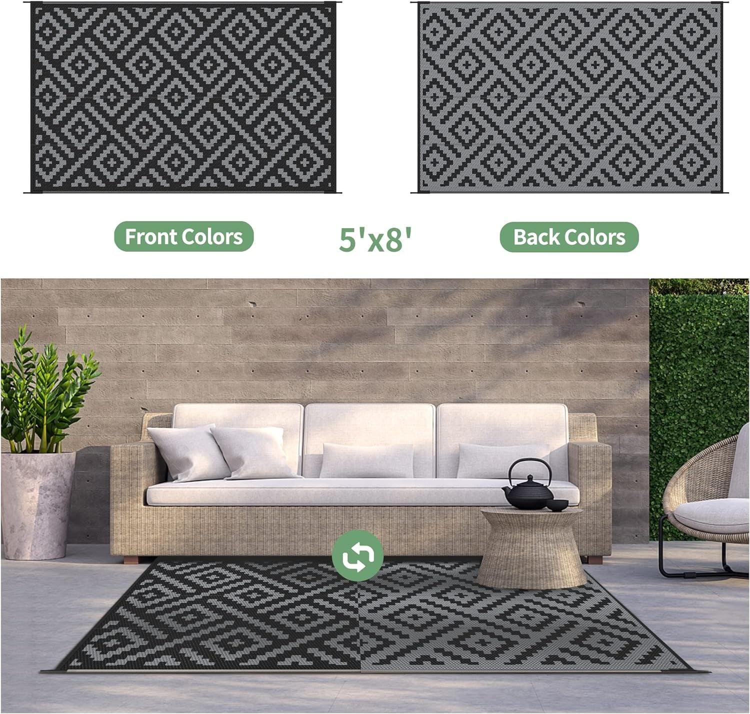 - Extended Lifespan · Dual-Sided Wear Resistance: The GENIMO outdoor rug features a reversible design with two classic geometric patterns, doubling its lifespan through alternating use. The dark-toned surface effectively conceals dirt, stains, and fall debris, maintaining a pristine appearance even in rugged environments. Perfect outdoor patio rugs, RV mats, and camping rugs for indoor-outdoor transition zones—effortlessly switch sides for practicality and timeless decor.
