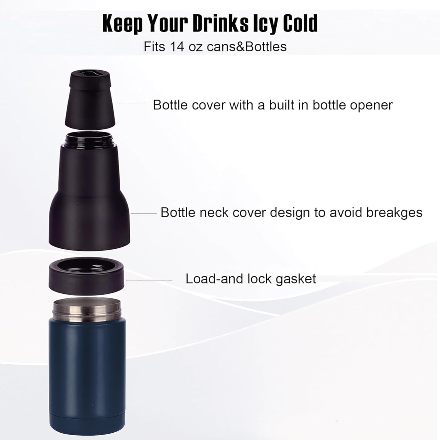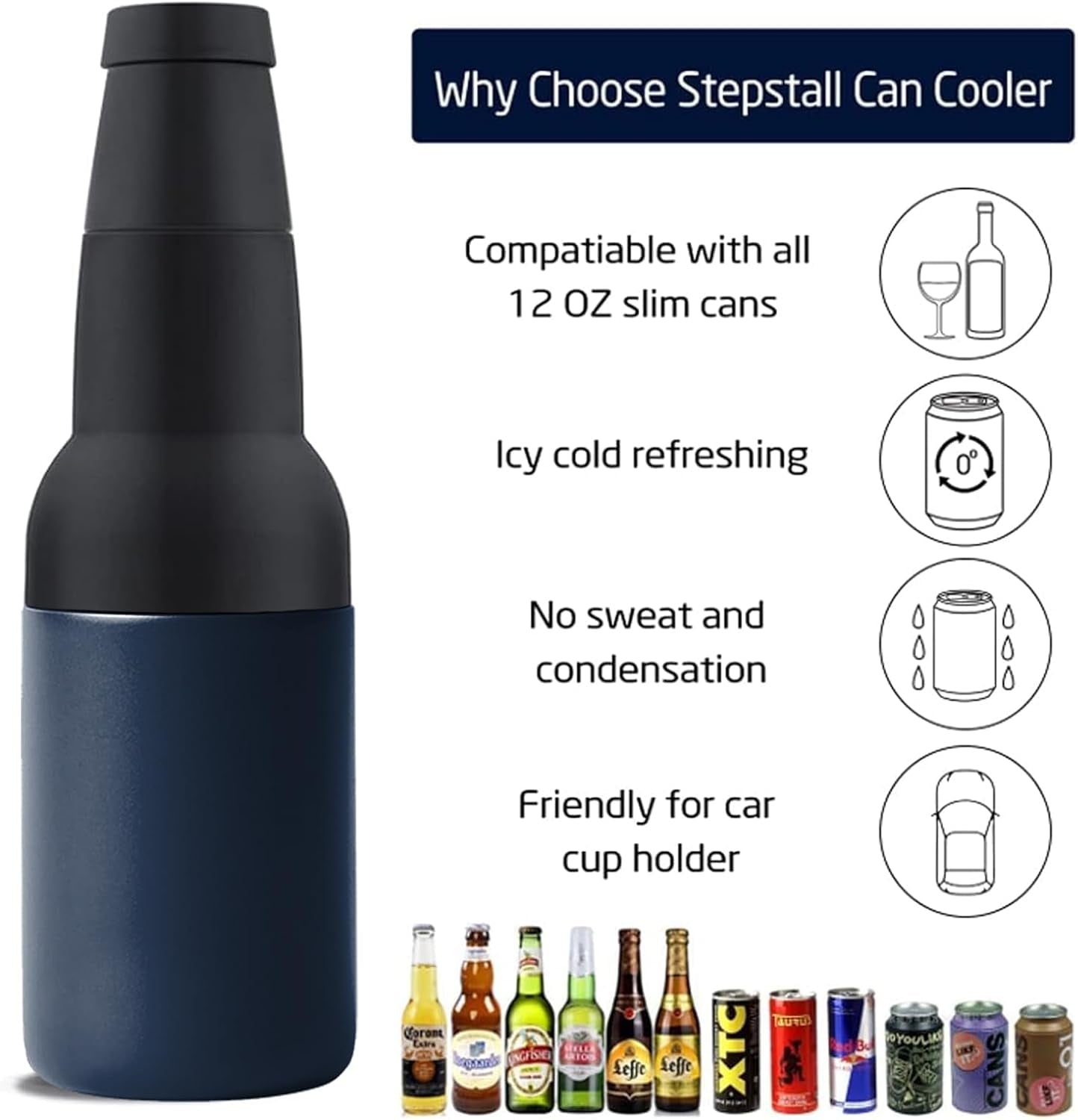 - 【Fits 14 oz cans& bottles】Stepstall bottle cooler works with all slim-style 14 oz beer, soda canned drinks, spiked seltzers and energy drinks. With built-in beer bottle opener, it makes your beer drinking more convenient and enjoyable.