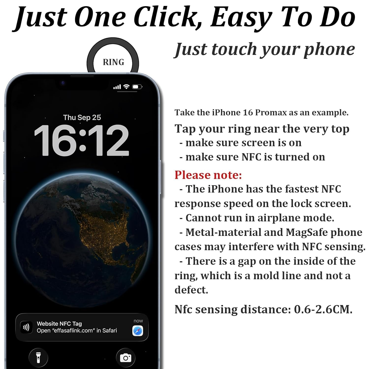 - 【High-end Technique】The design of the ring is more fashionable and technological when used as business card or social sharings. Just tap the smartphone with the ring on your finger to share the business or social information. The NFC chip of the ring adopts a 360° all-round sensing design, and the connection with the mobile phone is very smooth.