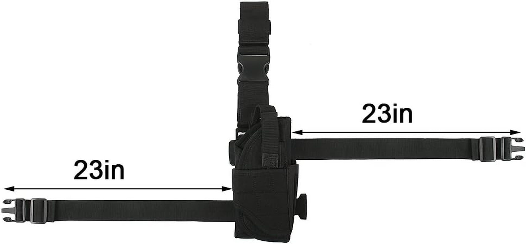 Nehostertfy Adjustable Drop Leg Holster can be fully adjustable for leg and fits 19-27” of thigh circumference. Design to meet the demands of tactical operation units. The Tactical Thigh holster can be attached in the waist belt and fasten to the thigh. Offers a pouch with flashlight mount. Fully adjustable wrap-around high thigh universal design for men and women. Fit for right handed.