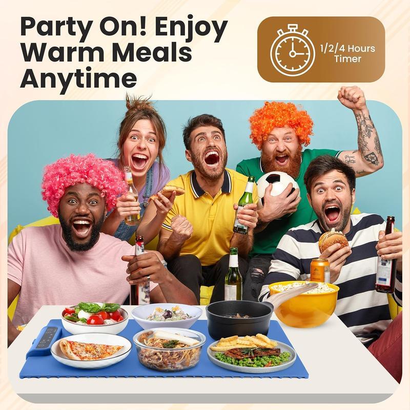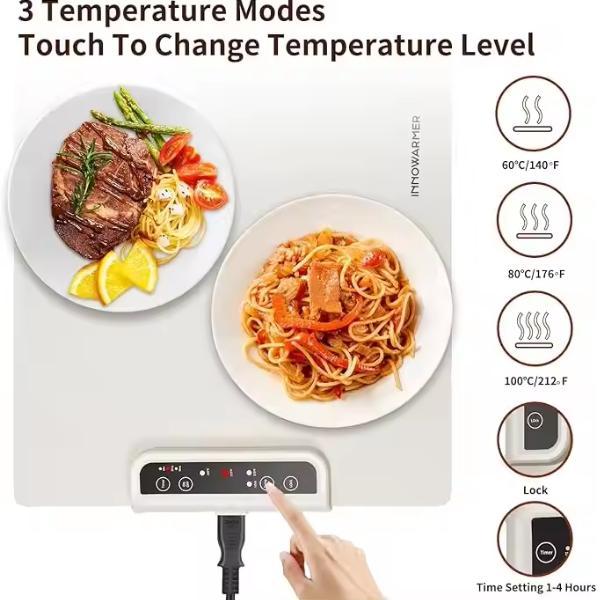 ①.Electric Heating Food Warming Mat features adjustable temperature ensuring precise heat distribution to keep meals warm evenly. Ideal for soups, meats, desserts, safety and energy efficiency during prolonged use.