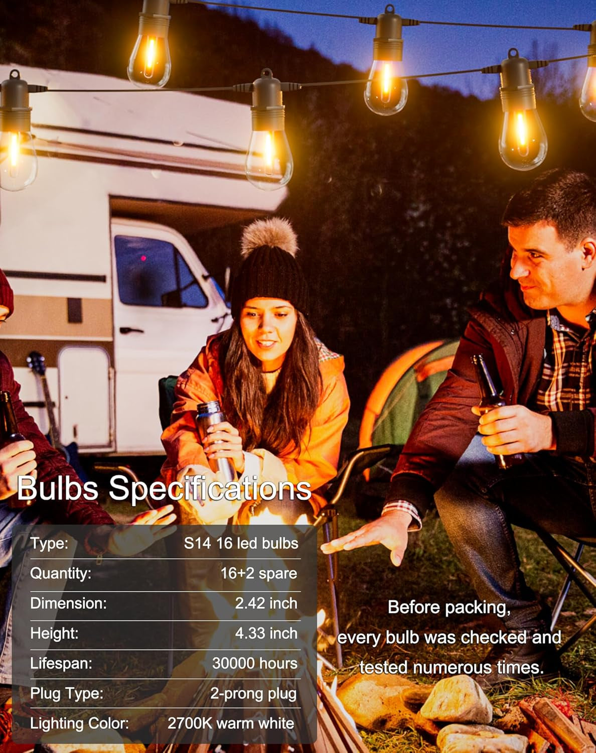 - Easy to Install: Outdoor lights string contain 16 pcs S14 LED bulbs with 1 replacements and waterproof end connector allows link up to 27 strands. Hanging loop is easier to set up with hooks, nails, guildwire and zip ties on the outside