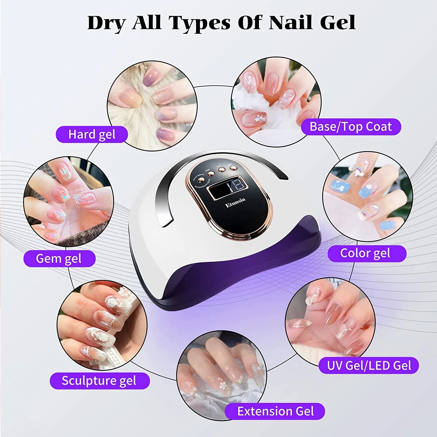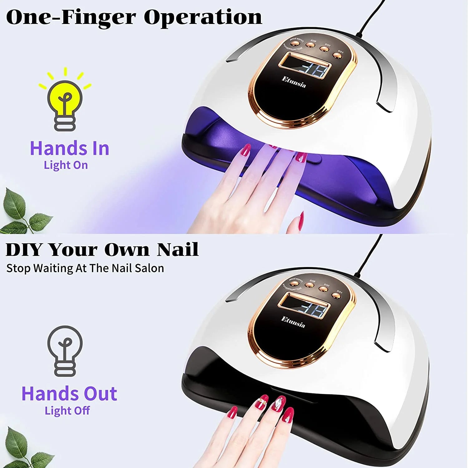 - 【4 timers and smart sensors】-UV LED nail lights have smart sensors for on/off (no switch). Place your hand in the nail lamp and it will automatically light up. The built-in LED digital time display shows the nail drying time, and has a time memory function, which can be set to a low heat mode of 10 seconds, 30 seconds, 60 seconds or 99 seconds.