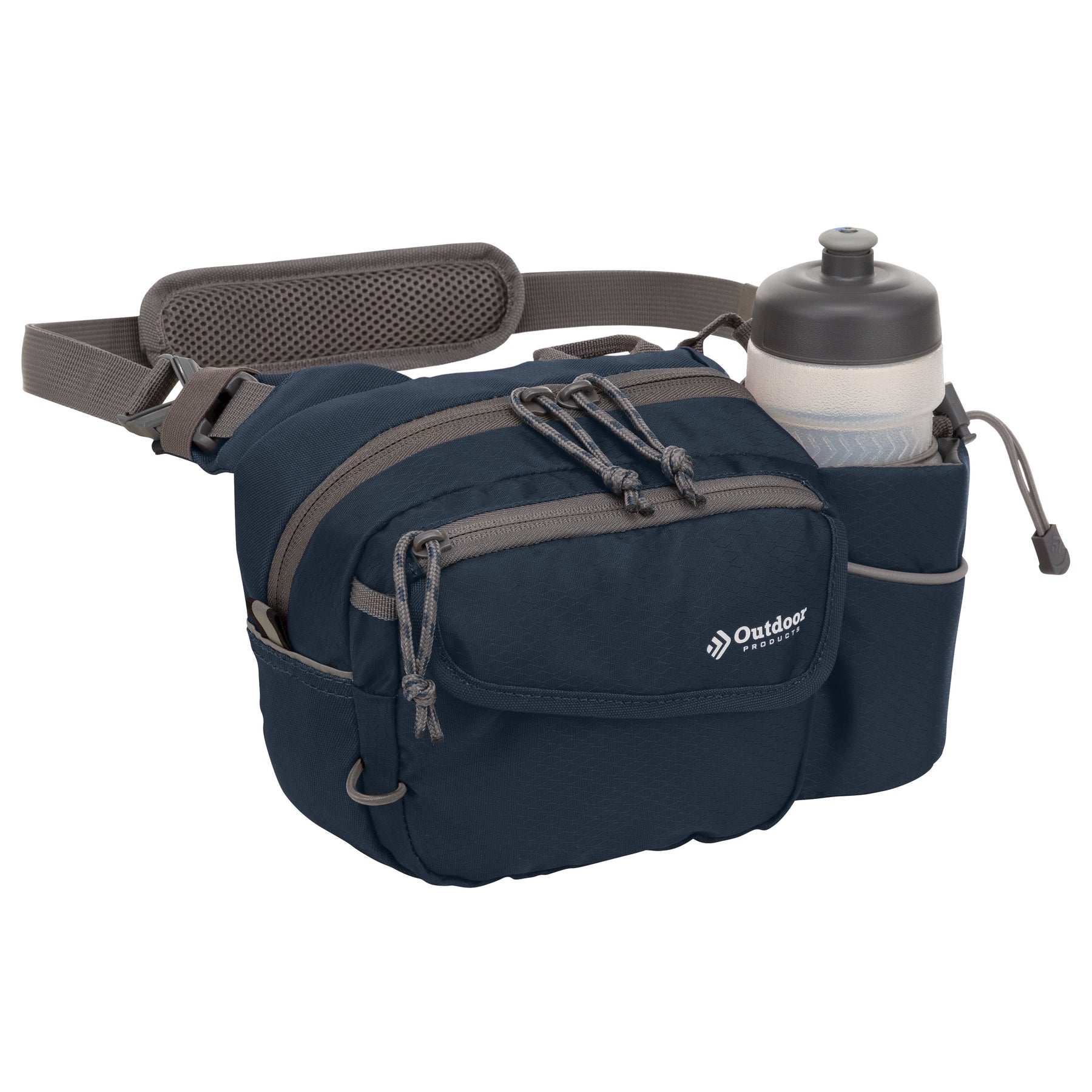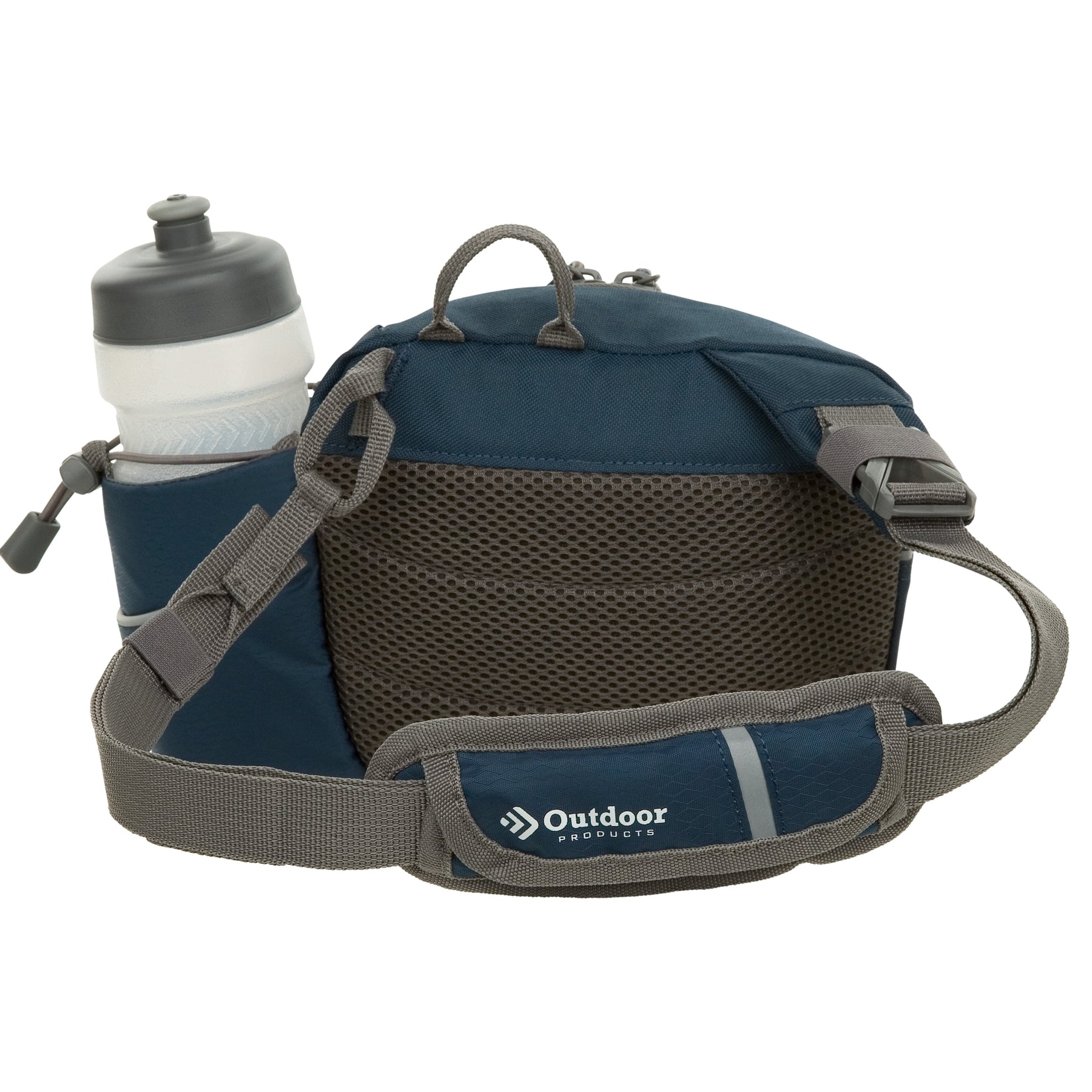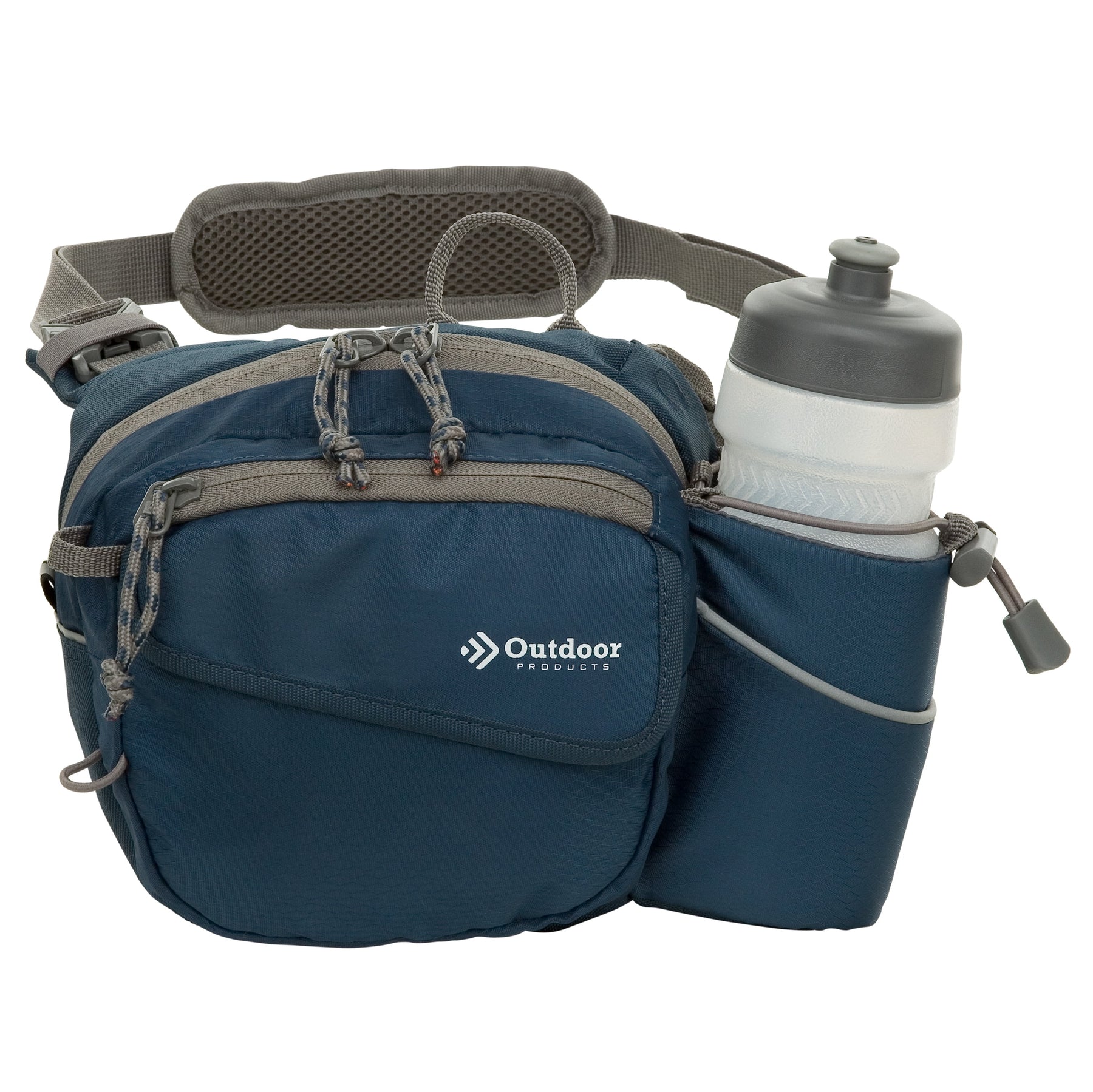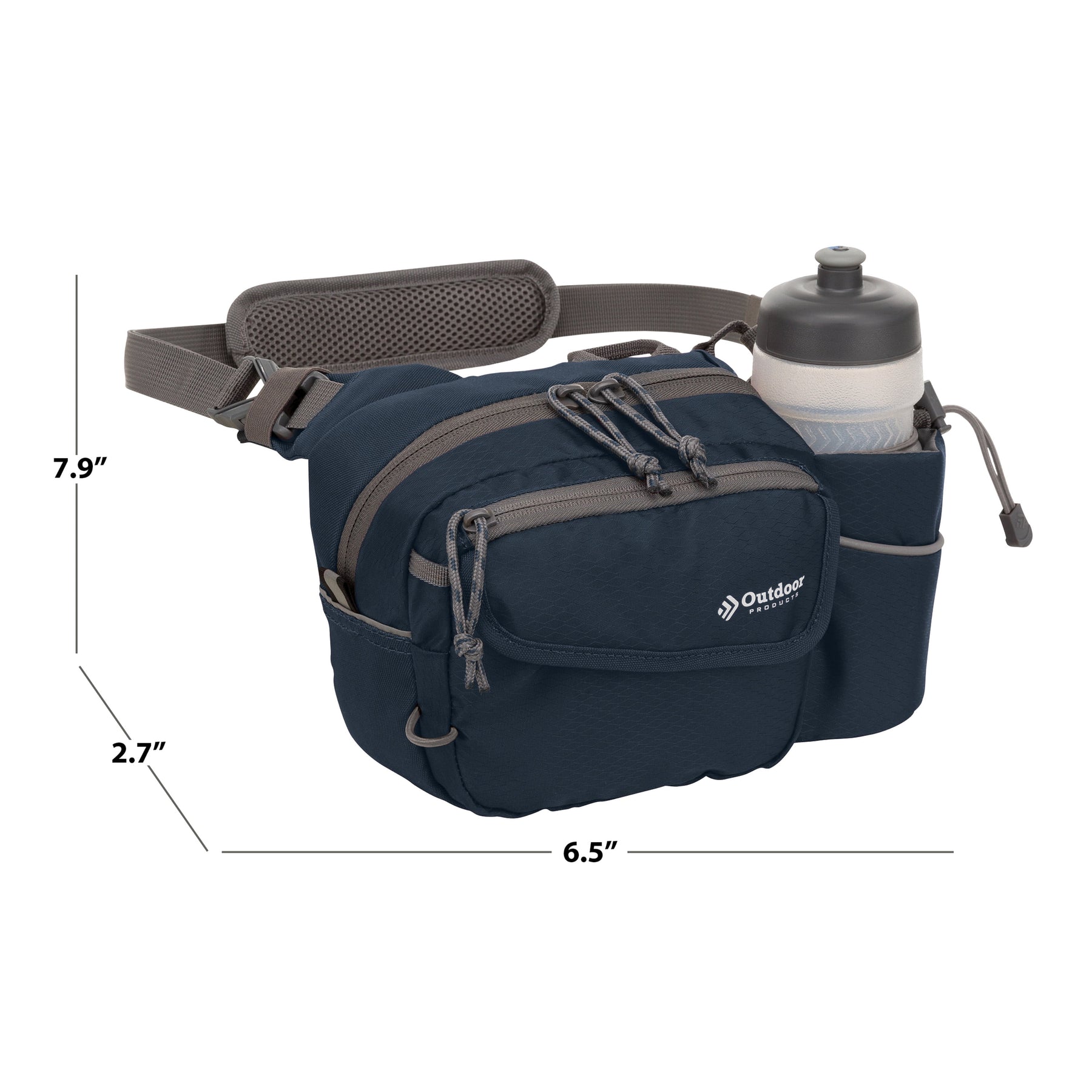 The navy Outdoor Products Melrose Walking Pack is a great item for hiking, international travel, commuting, sporting events, concerts, and your favorite theme parks. The unisex polyester 3 liter bag fits comfortably around the waist using the waist strap, or it can be worn as a shoulder bag using the padded shoulder strap. The waist belt will fit up to a 52" inch waist with adjustable buckle sliders. A squeezable 600mL (20oz) BPA-free bottle is included. The main compartment is great for storing your gear while on the go. The magnetic front pocket gives you easy and secure access to your essentials and the webbing loop is perfect to attaching various accessories. The headphone port provides cord access while keeping your electronics protected. It is suitable for a senior, adult, teen, and kids. The lifetime guarantee ensures you will be using this Outdoor Products waistpack for many more walks to come.