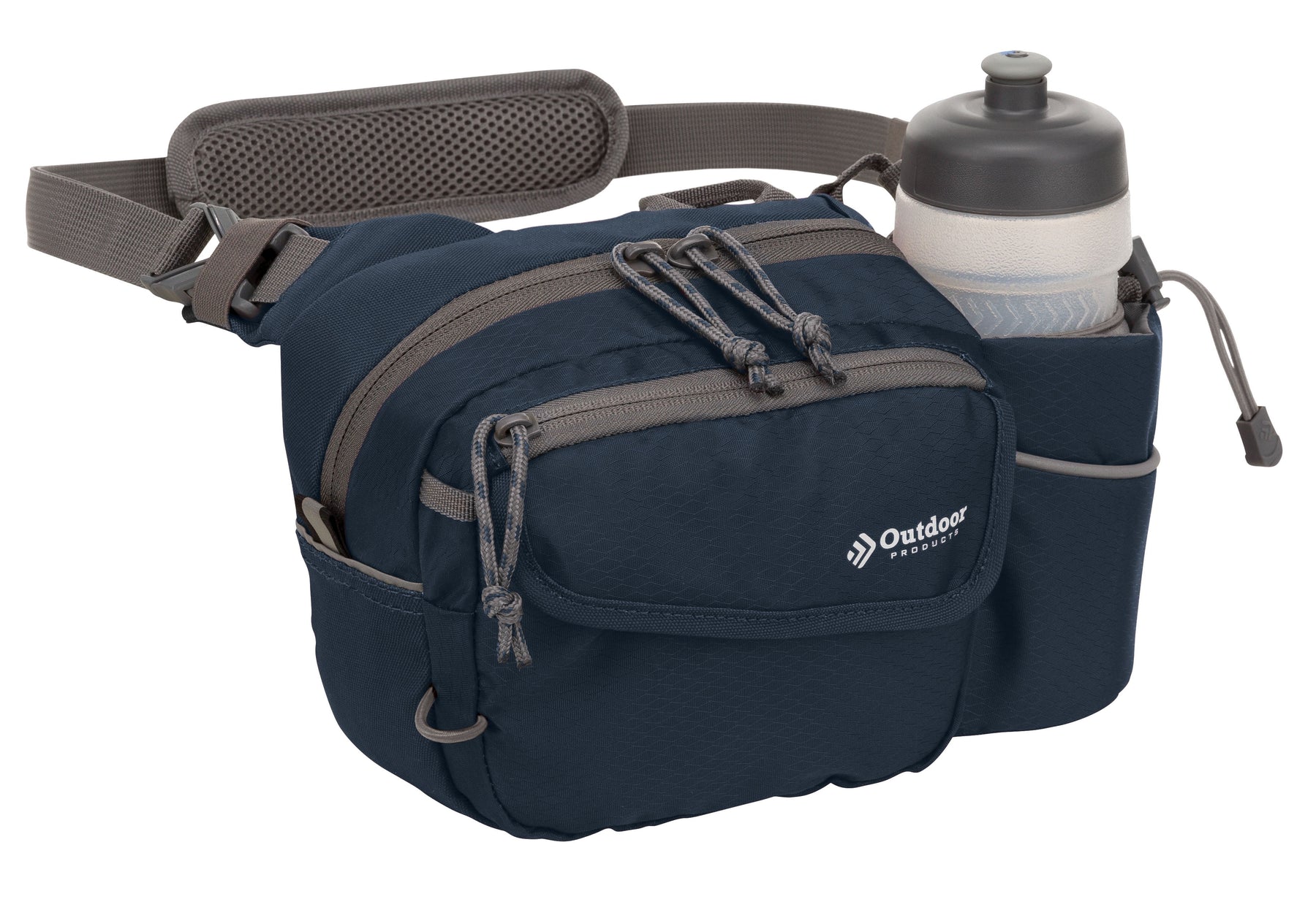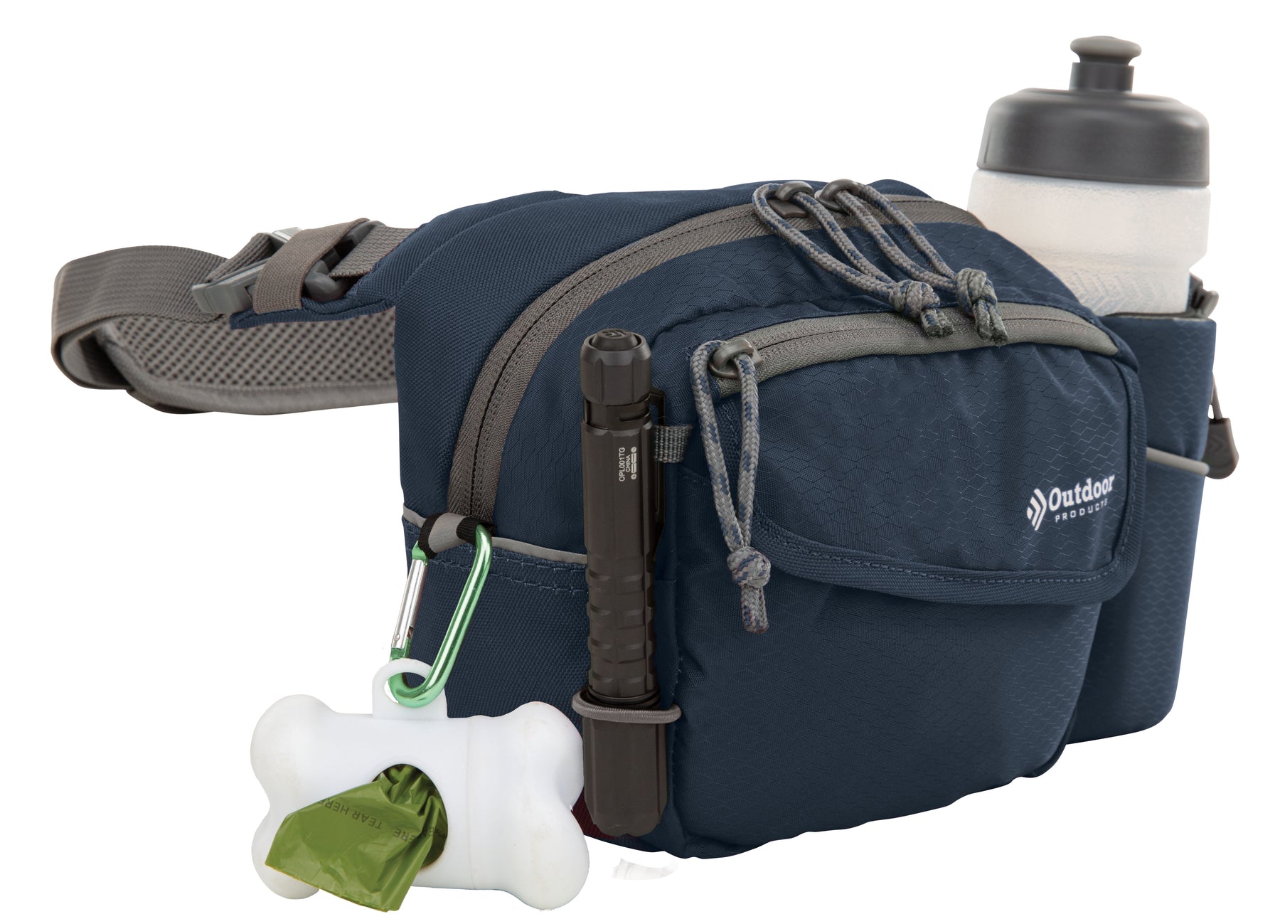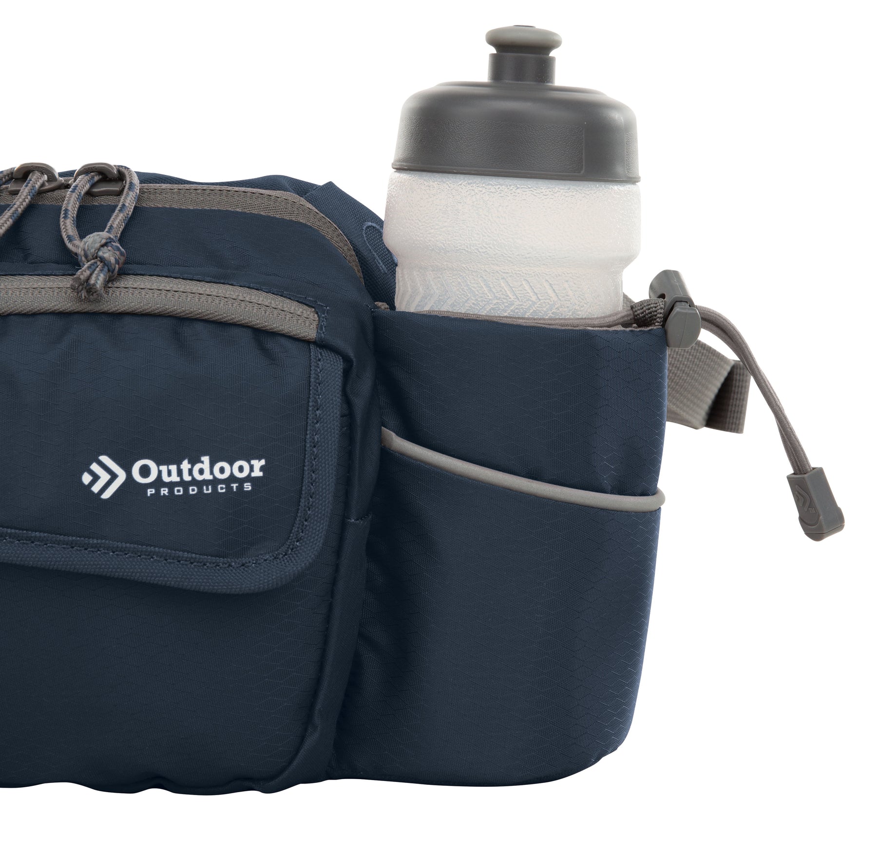 The navy Outdoor Products Melrose Walking Pack is a great item for hiking, international travel, commuting, sporting events, concerts, and your favorite theme parks. The unisex polyester 3 liter bag fits comfortably around the waist using the waist strap, or it can be worn as a shoulder bag using the padded shoulder strap. The waist belt will fit up to a 52" inch waist with adjustable buckle sliders. A squeezable 600mL (20oz) BPA-free bottle is included. The main compartment is great for storing your gear while on the go. The magnetic front pocket gives you easy and secure access to your essentials and the webbing loop is perfect to attaching various accessories. The headphone port provides cord access while keeping your electronics protected. It is suitable for a senior, adult, teen, and kids. The lifetime guarantee ensures you will be using this Outdoor Products waistpack for many more walks to come.