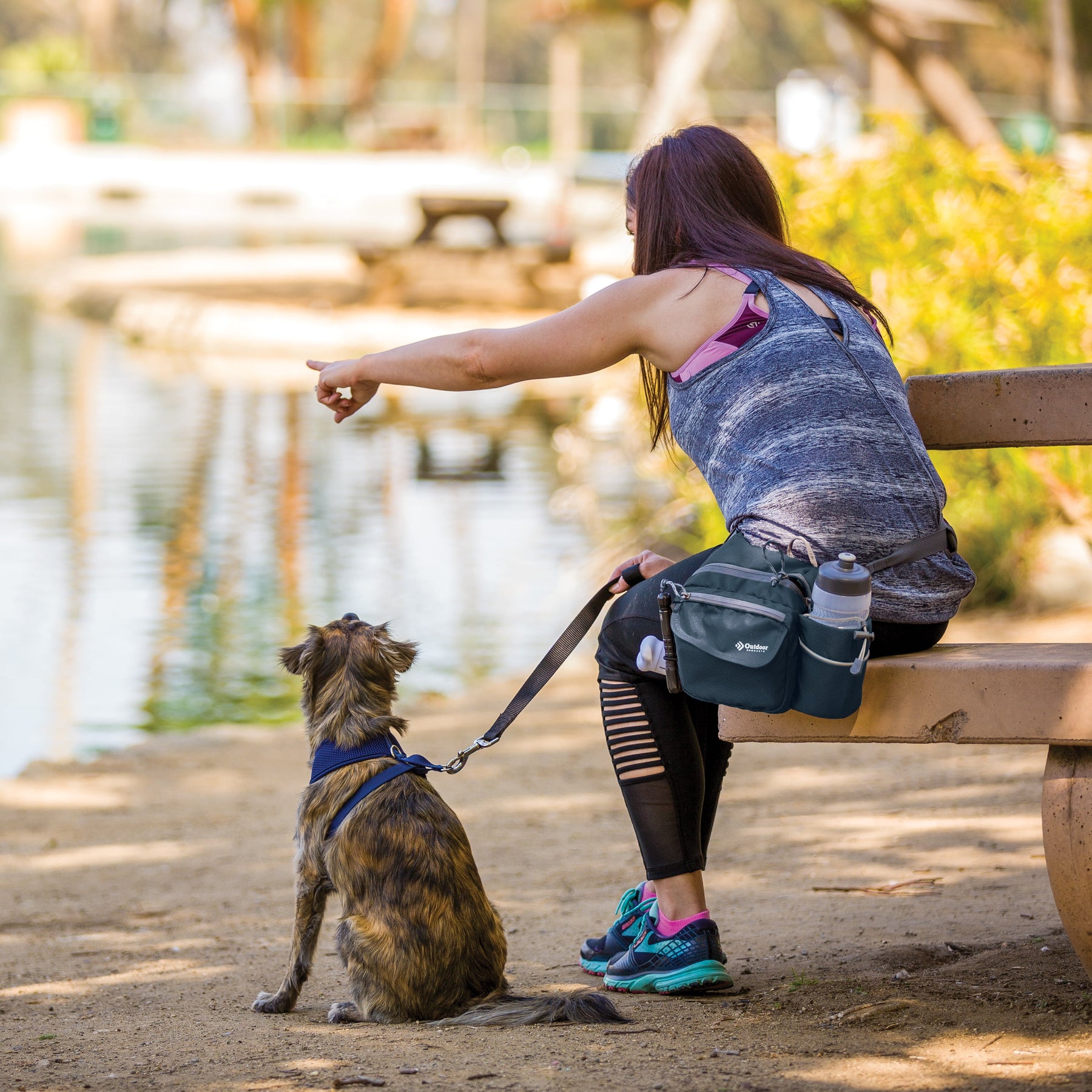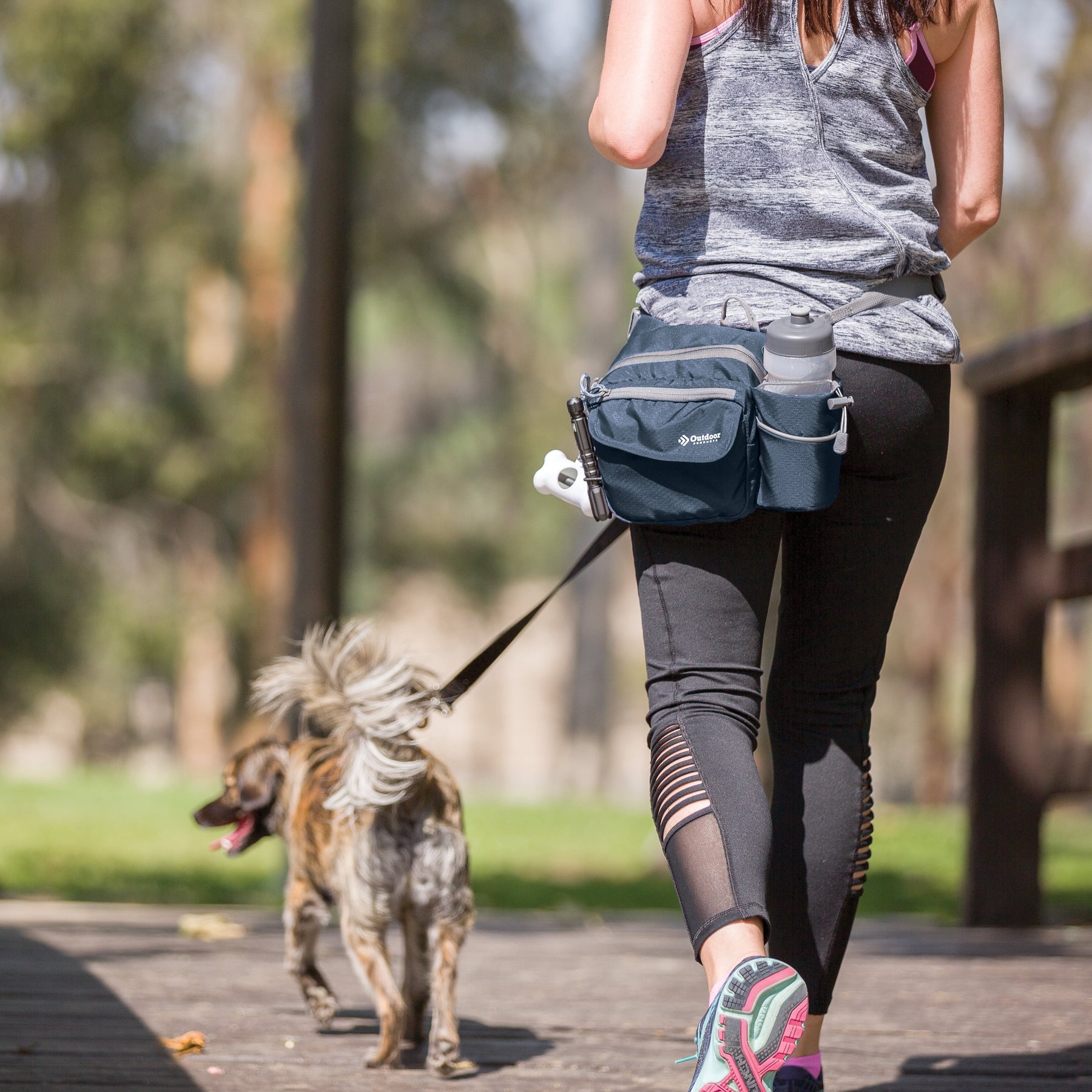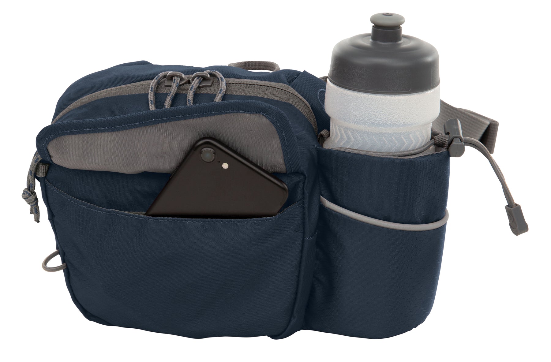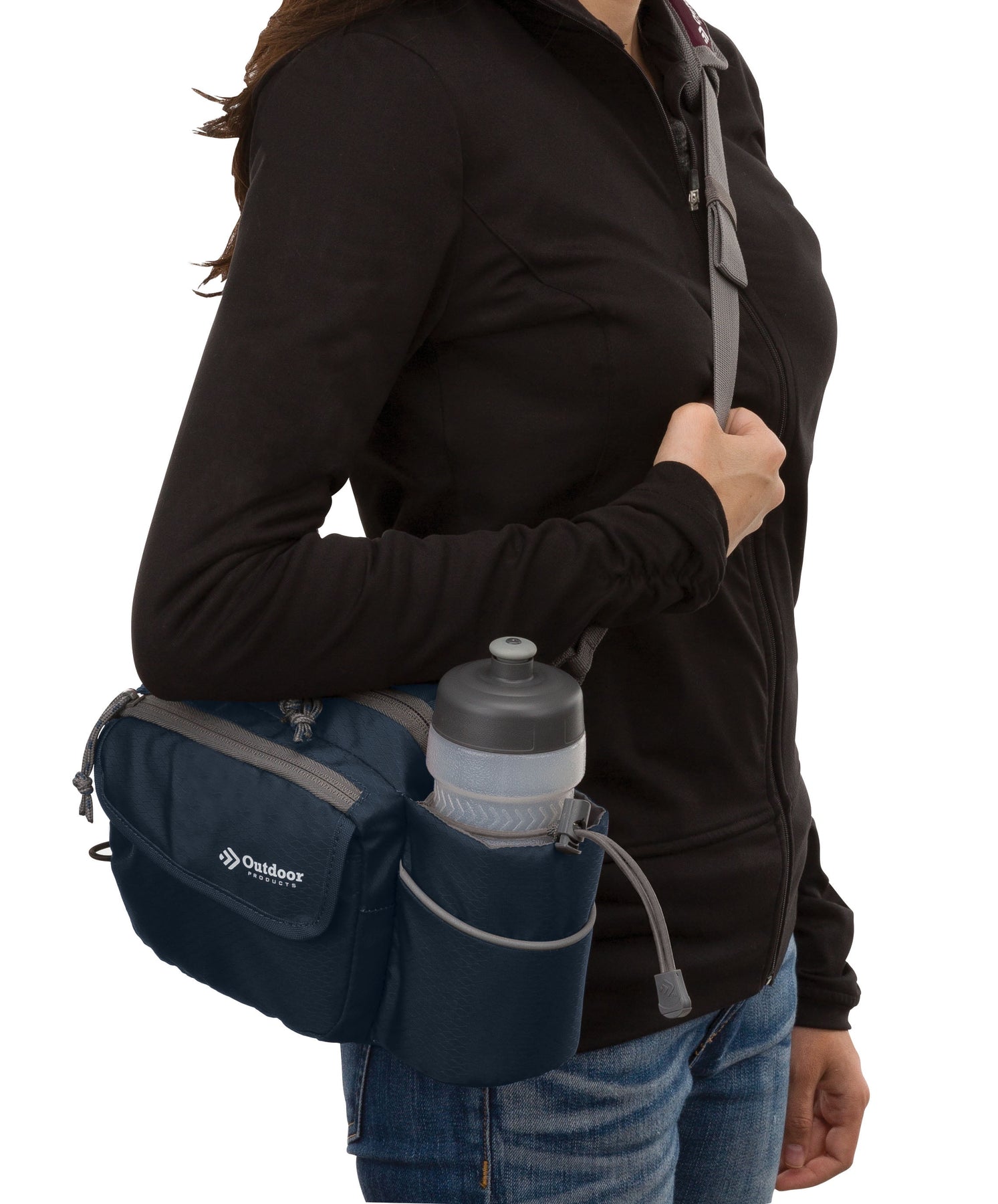 The navy Outdoor Products Melrose Walking Pack is a great item for hiking, international travel, commuting, sporting events, concerts, and your favorite theme parks. The unisex polyester 3 liter bag fits comfortably around the waist using the waist strap, or it can be worn as a shoulder bag using the padded shoulder strap. The waist belt will fit up to a 52" inch waist with adjustable buckle sliders. A squeezable 600mL (20oz) BPA-free bottle is included. The main compartment is great for storing your gear while on the go. The magnetic front pocket gives you easy and secure access to your essentials and the webbing loop is perfect to attaching various accessories. The headphone port provides cord access while keeping your electronics protected. It is suitable for a senior, adult, teen, and kids. The lifetime guarantee ensures you will be using this Outdoor Products waistpack for many more walks to come.