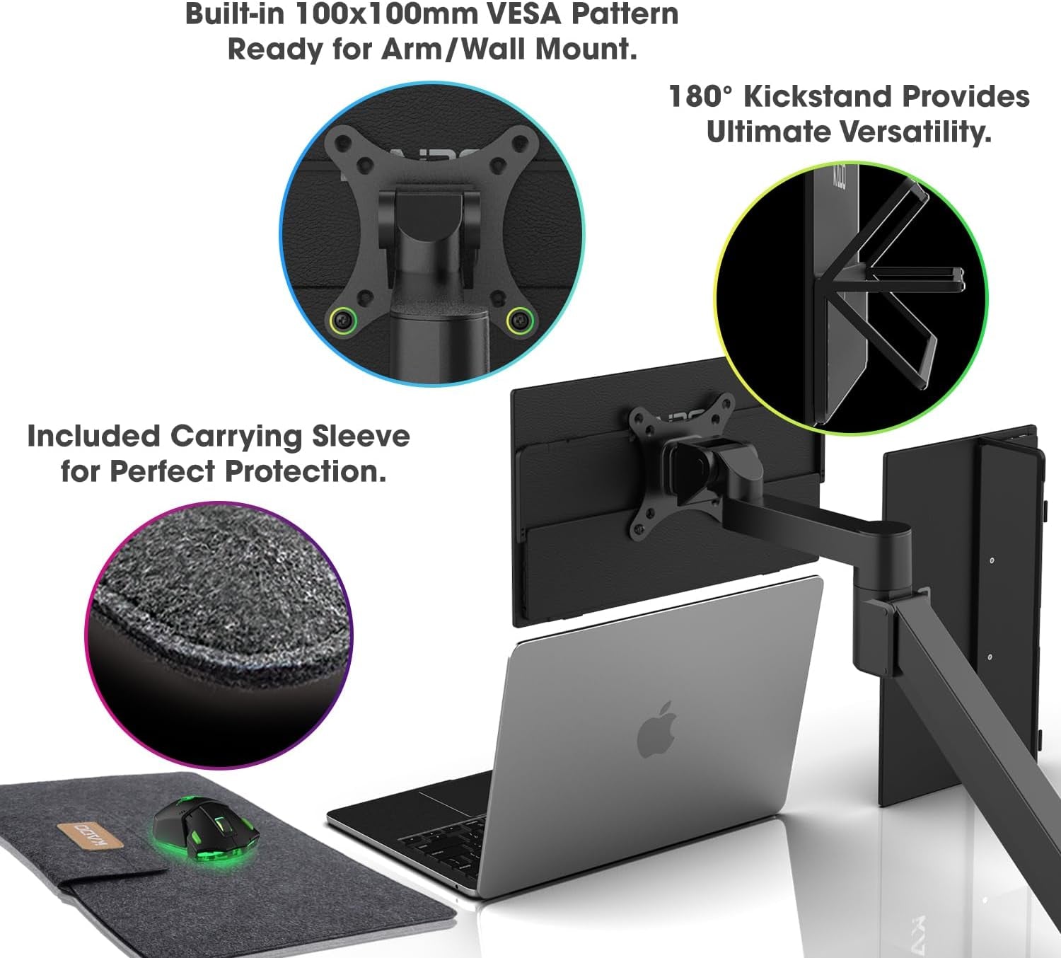 - VESA Mountable: The portable monitor comes equipped with 100x100mm VESA mounting pattern so you can mount it to your monitor arms or stands to build your dream dekstop setup.