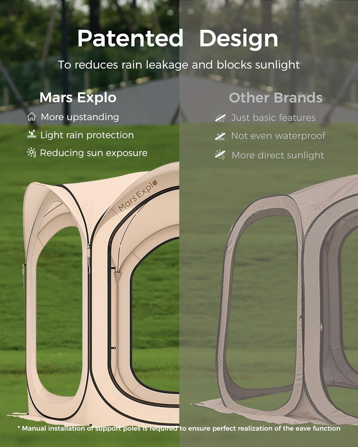 - ๐๐ฉ๐๐ถ๐ข๐จ๐ฎ๐ฌ & ๐๐ง๐ก๐๐ง๐๐๐ Design๏ผโ 300D Oxford Fabric + Fiberglass Roof: Heavy-duty 300D Oxford fabric paired with rust-resistant steel frame and fiberglass-reinforced top for water resistance and expanded space. Double-stitched seams, dual-sided zippers, and adjustable door curtains ensure durability and convenience.