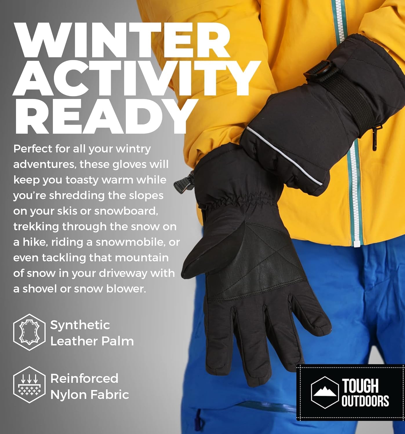 Our winter ski gloves keep your hands warm and dry so you'll be ready for anything. With three heavy-duty thermal layers between you and the elements, the cold doesn’t stand a chance. The reinforced synthetic leather palm protects your hands against abrasion, maintains your dexterity, and increases your grip on your ski poles, shovel, or your snowmobile.