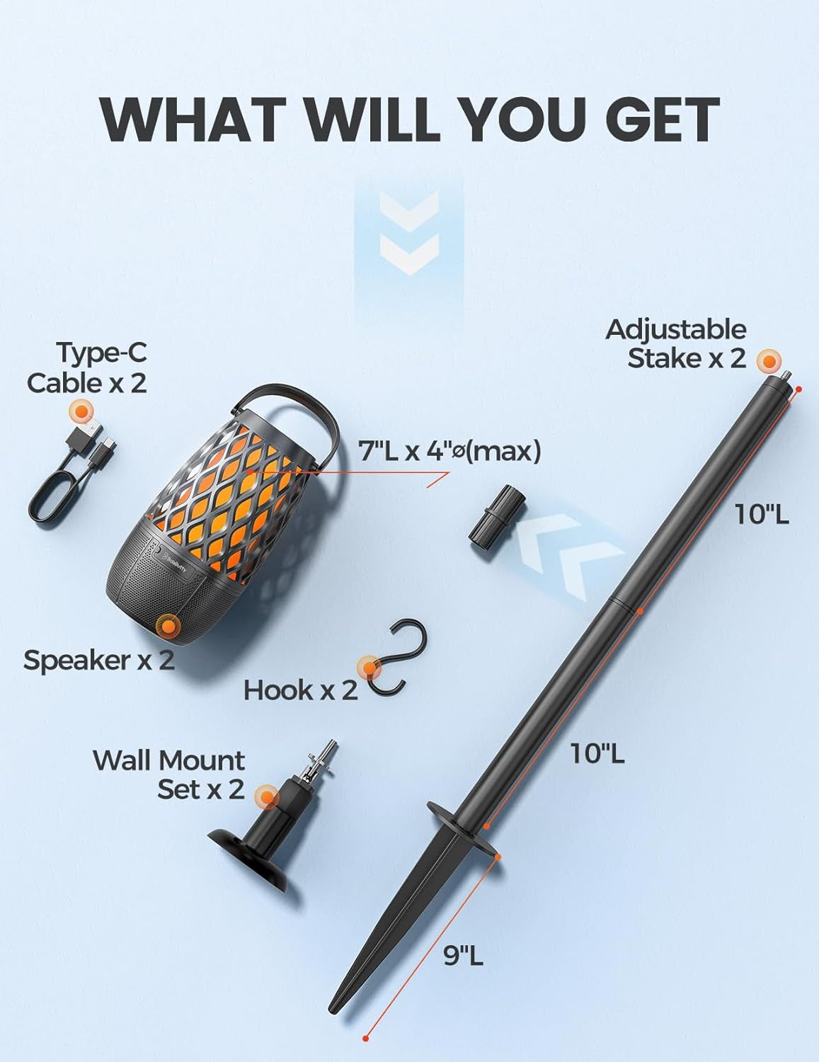 - 3-Mode 360° Light Show - The LED portable speakers also work as an independent LED atmosphere lamp, patio light, or portable lantern. You can switch between flickering flame light, breathing candlelight, and solid amber light, or simply turn the light off. A pair of hooks, ground stakes, and wall mounts are included for convenient placement